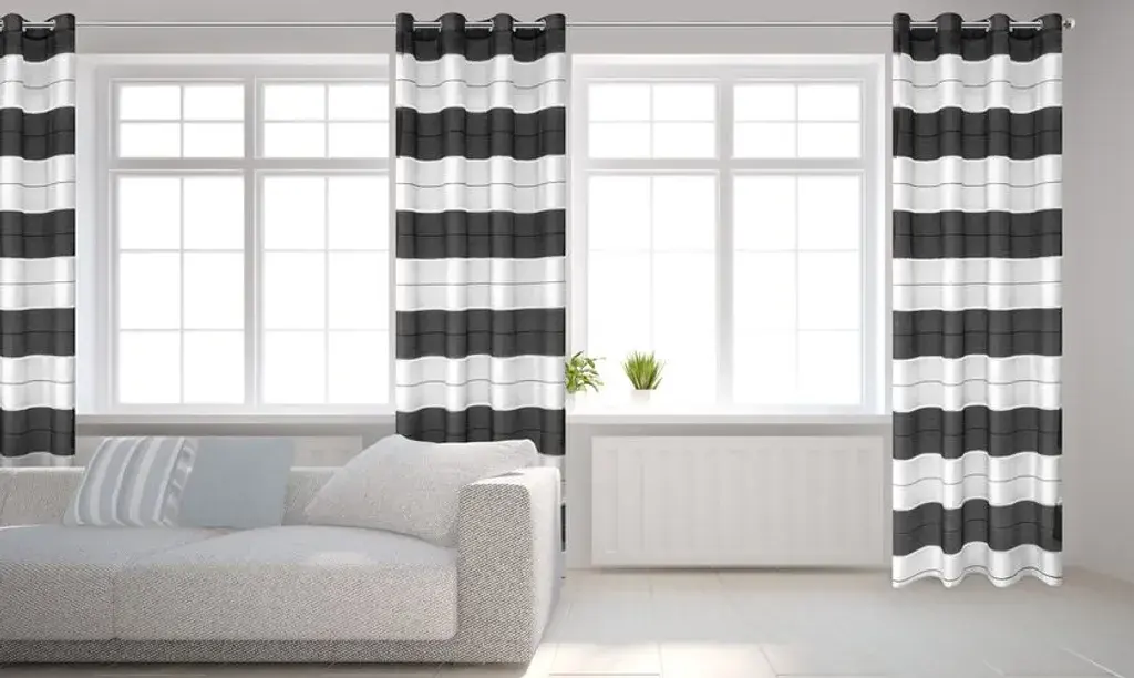Штора из ткани, украшенной неподвластной времени полоской. Такой декор прекрасно дополнит классические и современные интерьеры, придав помещению неповторимый облик. Штора подвешивается на восемь декоративных кругов диаметром 4 см, которые собирают ткань в элегантные, ровные складки.