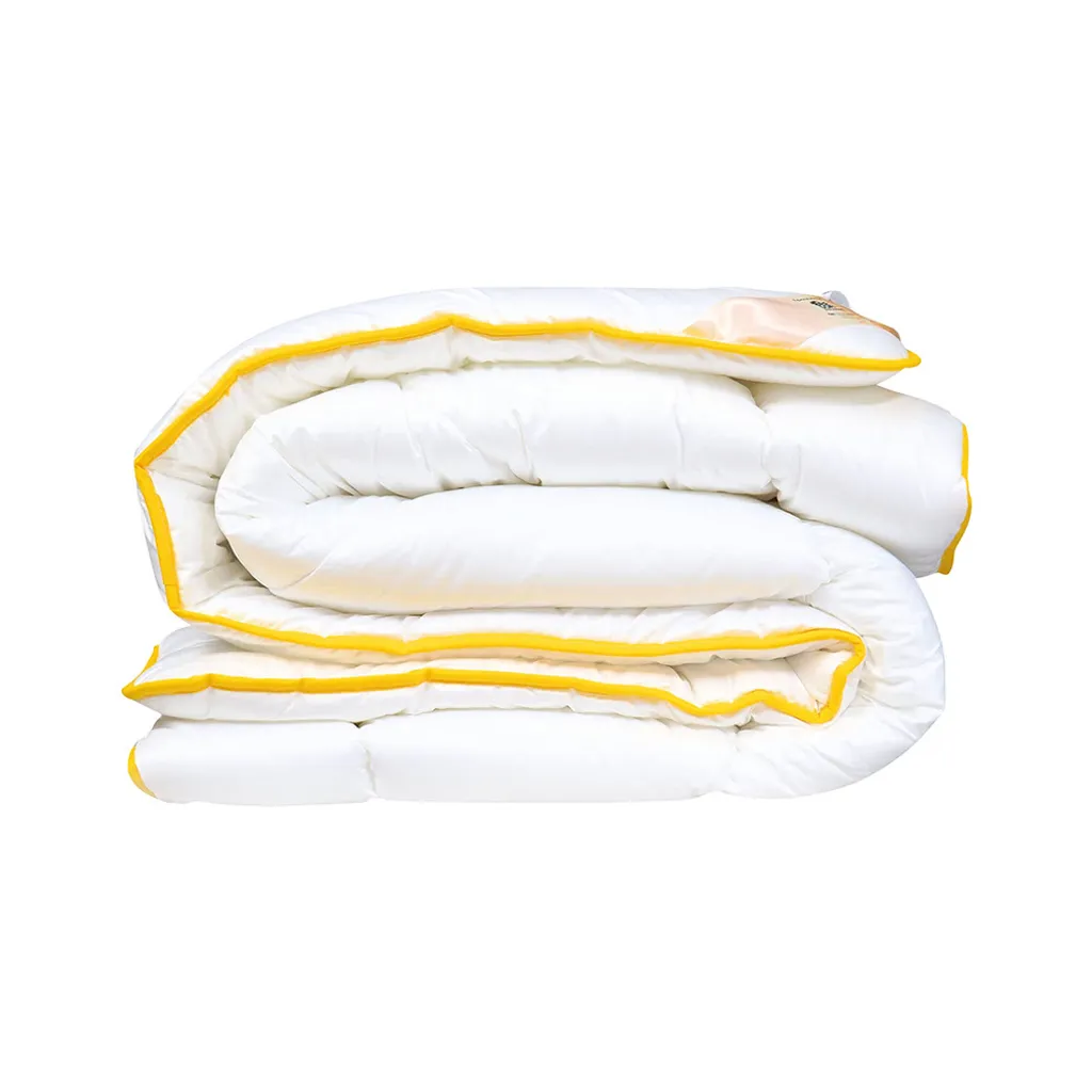 Одеяло кассетной конструкции, сшито по технологии теплый шов, что обеспечивает лучшую теплоизоляцию. Сетка плотно закрыта, что предотвращает смещение наполнителя между камерами. Белые изделия имеют желтую окантовку.