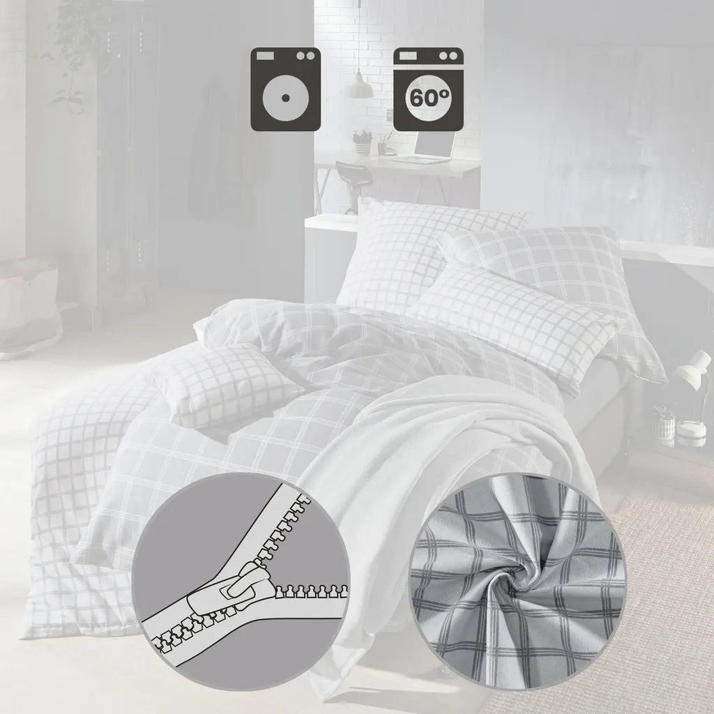 Erwin Müller Двустороннее постельное белье из высококачественной фланели. Изысканный дизайн придает классическому клетчатому рисунку современный вид. Гармоничные цвета создают уютную атмосферу. Вам понравится уютно укутаться в мягкую ткань с начесом из тонкой пряжи. Оно невероятно комфортное и согреет вас холодными ночами. Дышащее, приятное к коже и терморегулирующее. Легко надевать благодаря практичной молнии.