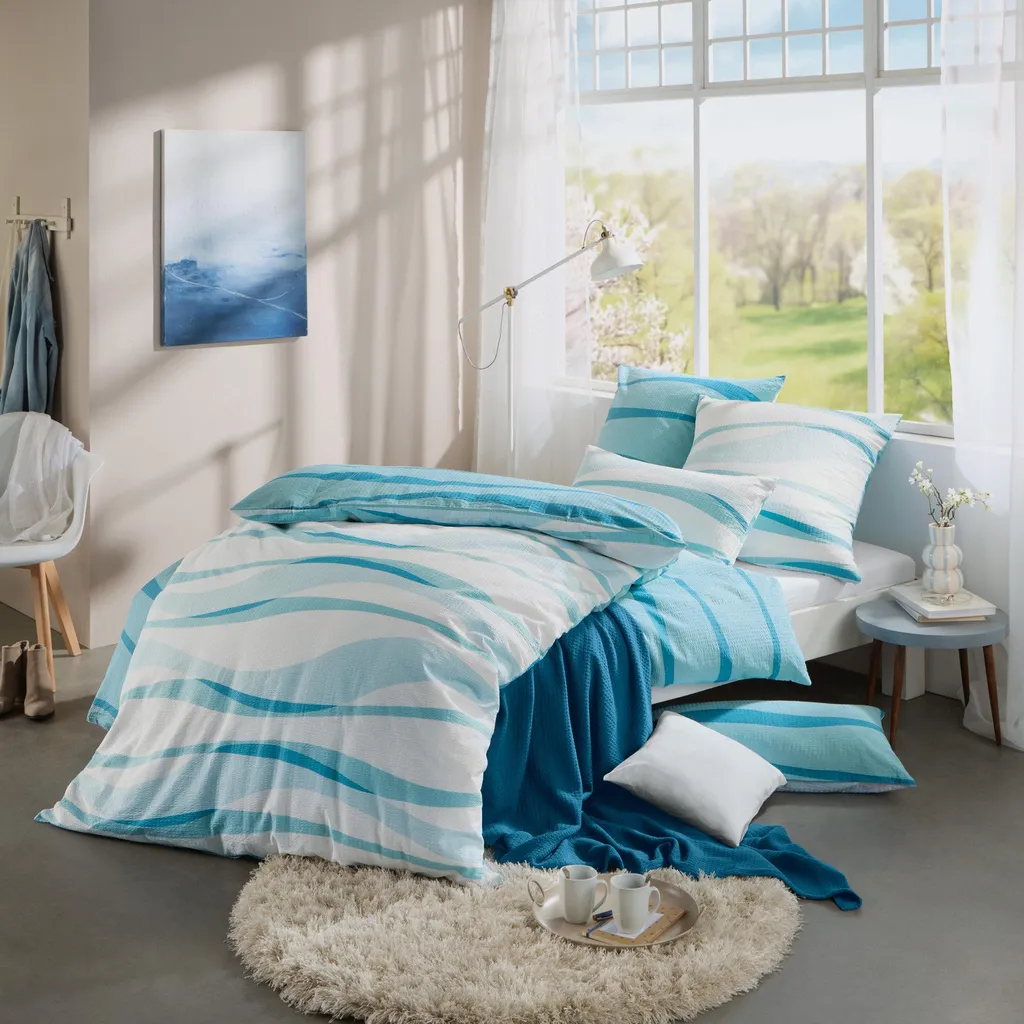 Двустороннее постельное белье Erwin Müller из сирсакера. Графический волнистый рисунок добавляет свежий, яркий штрих. Двухцветный дизайн создает красивый контраст. Особенно летом вы оцените его приятную легкость, термо- и влагорегулирующие свойства благодаря устойчивому жатому эффекту. Оно не только приятно для кожи и дышащее, но также быстро сохнет, не мнется и легко устанавливается обратно на кровать благодаря застежке-молнии. Характеристики товара: - Двустороннее постельное белье - Новый цвет - Графический дизайн - Качество: сирсакер с характерной жатой текстурой - Фирменная молния - Не гладить - Гипоаллергенный - Материал: 100% хлопок (BW) - Инструкции по стирке: - Стирать при 60°C - Не отбеливать - Сушить в стиральной машине при низкой температуре - Не гладить - Не подвергать химчистке