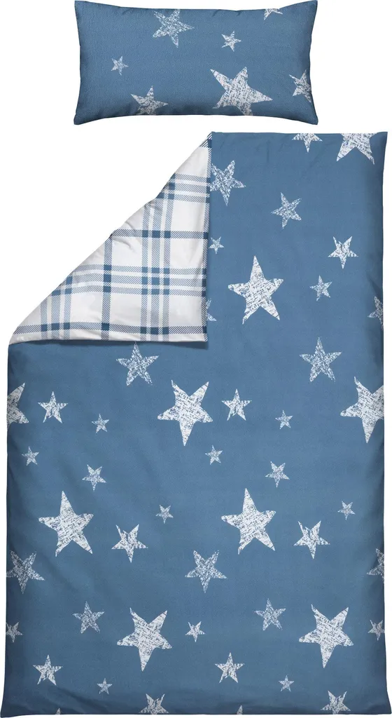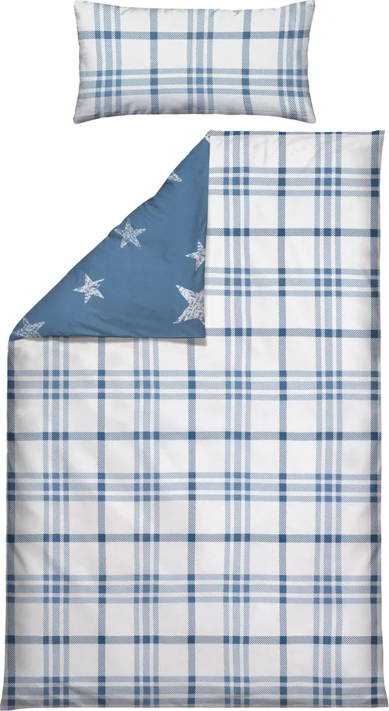 Erwin Müller Двустороннее фланелевое постельное белье. Сказочные звезды с одной стороны, классическая клетка с другой и гармонично подобранная цветовая гамма создают ощущение чистого уюта. Позвольте себе окунуться в мягкость и уют. Плотная ткань с бархатистым начесом согреет вас холодными ночами. Этот материал не только приятен для кожи, дышащий и терморегулирующий, но также прост в уходе и легко надевается благодаря практичной молнии.