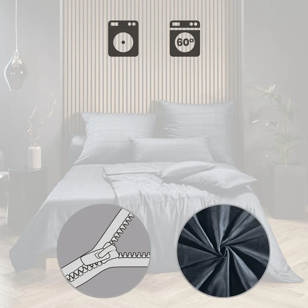 Постельное белье Mako Damask от Erwin Müller в Пассау. Тканый клетчатый узор элегантно мерцает, подчеркивая его изысканный характер. Насладитесь прекрасным микроклиматом в этой гладкой, бархатисто-мягкой, тонкотканой ткани. Она легкая, терморегулирующая и обладает стойким блеском. Изготовлено из тончайшей гребеной и мерсеризованной пряжи. Легко надевается благодаря практичной молнии.