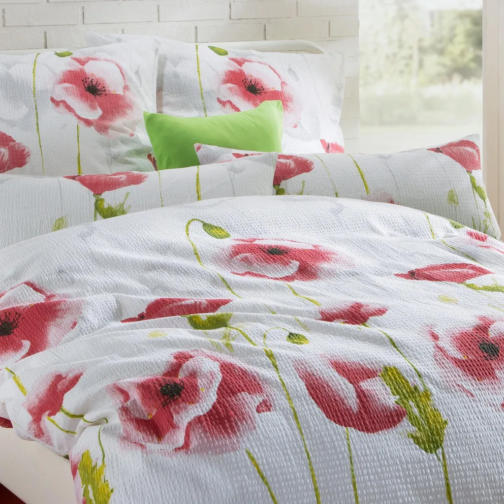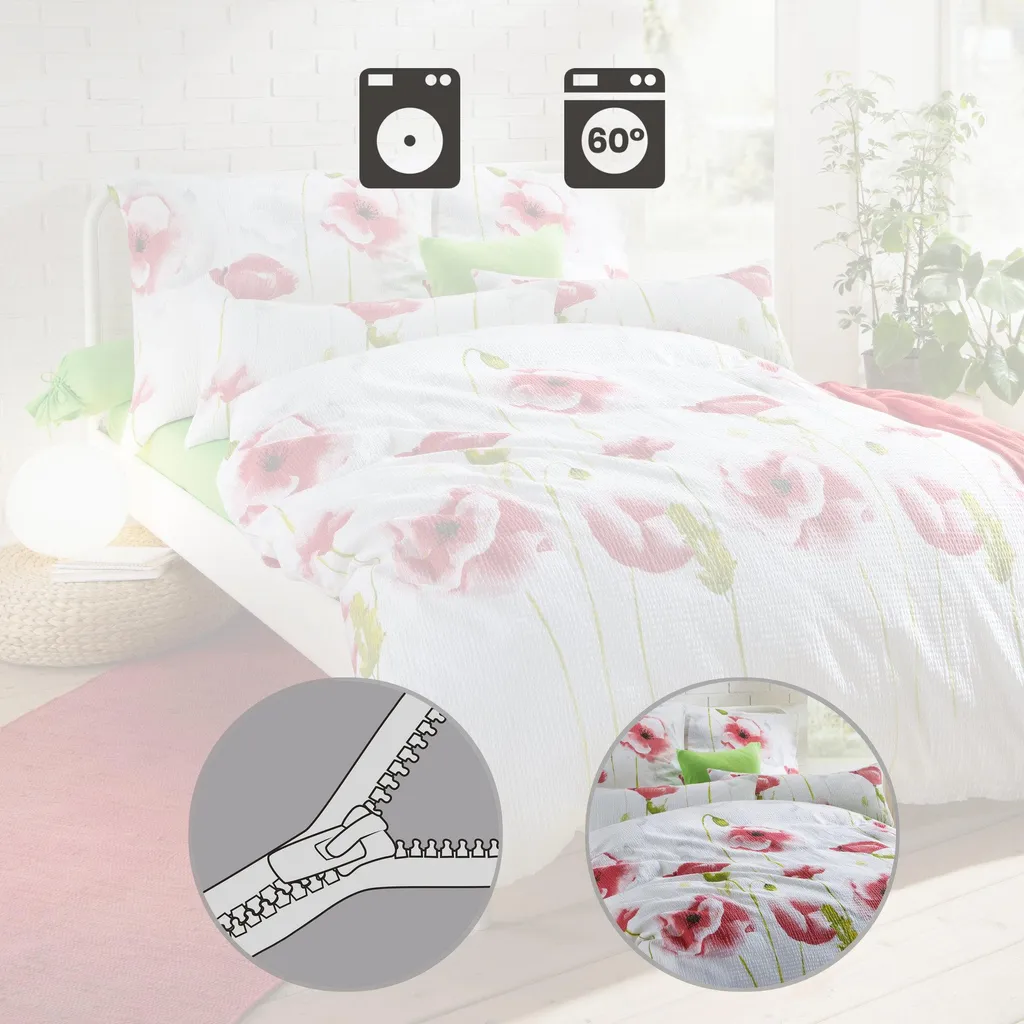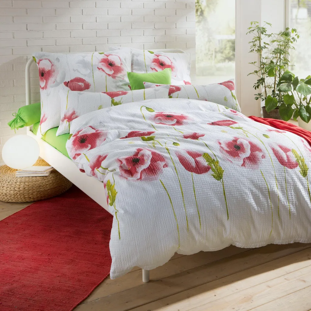 Постельное белье из сирсакера Erwin Müller. Очаровательные маки наполнят вашу спальню летним настроением. Особо тонкая пряжа с гофрированной полосатой текстурой дарит легкость и воздушность. Мягкое на ощупь, приятное к телу и регулирующее температуру. Вас быстро поразит простота ухода, ведь это простое постельное белье практически не мнется - просто постирайте, высушите, и благодаря молнии его легко положить обратно на кровать.