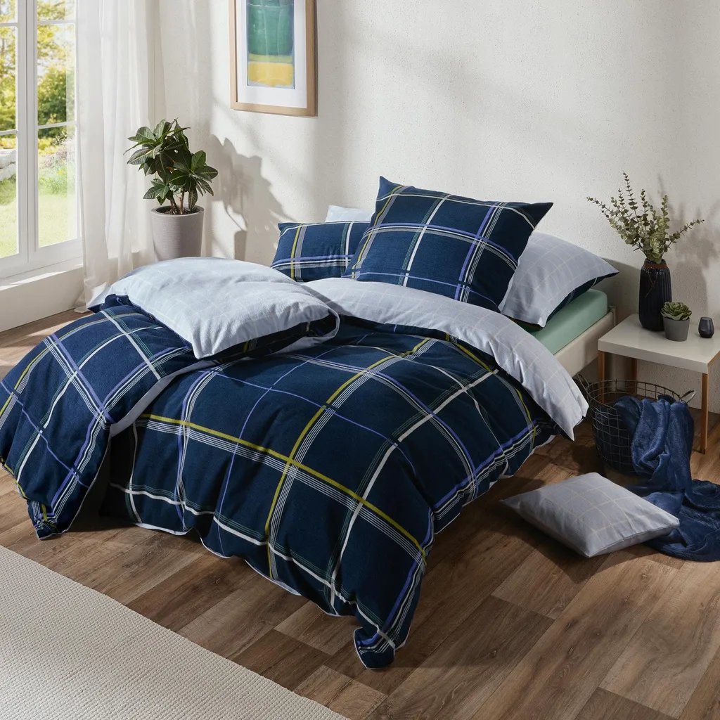 Erwin Müller Двустороннее постельное белье из высококачественной фланели. Два идеально сочетающихся клетчатых узора придадут вашей спальне свежий вид. Просто переверните его на другую сторону в зависимости от настроения. Мягкая, гладкая ткань из тонких гребенных нитей - настоящее удовольствие. Оно невероятно комфортно и окутает вас теплом и уютом в холодные зимние месяцы. Это качество не только дышащее, приятное для кожи и терморегулирующее, но также простое в уходе и простое в надевании благодаря молнии.