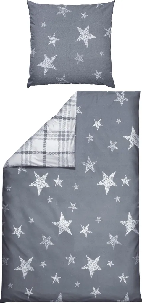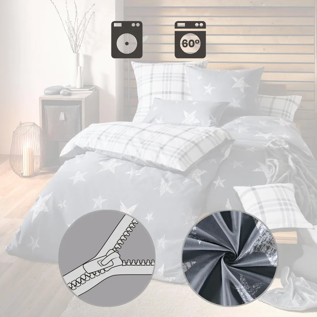 Erwin Müller Двустороннее фланелевое постельное белье. Сказочные звезды с одной стороны, классическая клетка с другой и гармонично подобранная цветовая гамма создают ощущение чистого уюта. Позвольте себе окунуться в мягкость и уют. Плотная ткань с бархатистым начесом согреет вас холодными ночами. Этот материал не только приятен для кожи, дышащий и терморегулирующий, но также прост в уходе и легко надевается благодаря практичной молнии.