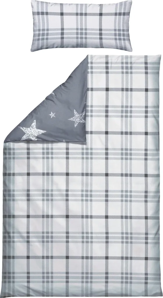 Erwin Müller Двустороннее фланелевое постельное белье. Сказочные звезды с одной стороны, классическая клетка с другой и гармонично подобранная цветовая гамма создают ощущение чистого уюта. Позвольте себе окунуться в мягкость и уют. Плотная ткань с бархатистым начесом согреет вас холодными ночами. Этот материал не только приятен для кожи, дышащий и терморегулирующий, но также прост в уходе и легко надевается благодаря практичной молнии.