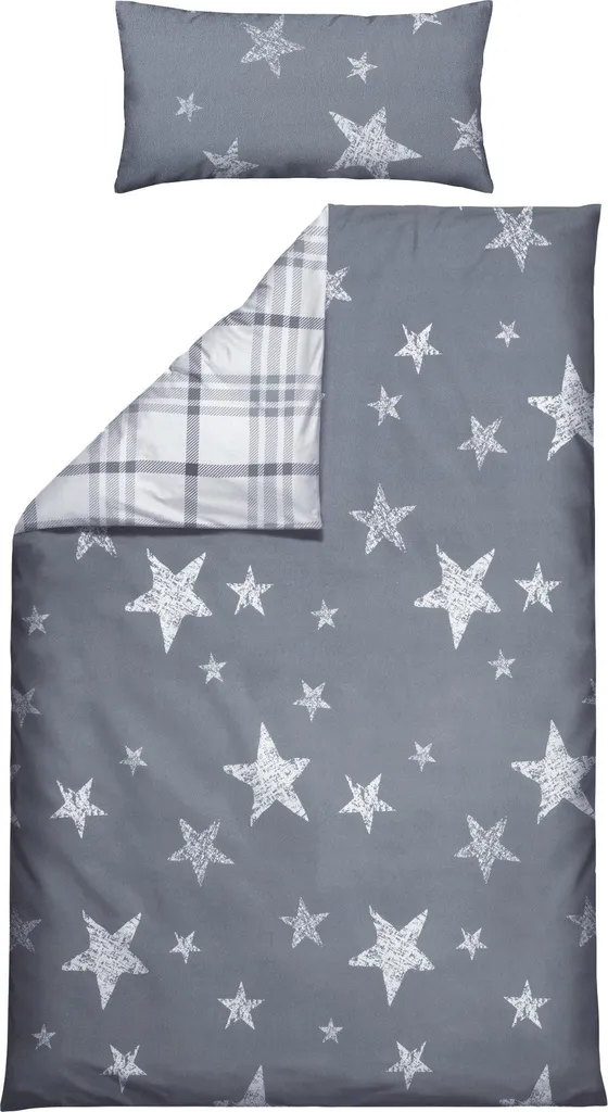 Erwin Müller Двустороннее фланелевое постельное белье. Сказочные звезды с одной стороны, классическая клетка с другой и гармонично подобранная цветовая гамма создают ощущение чистого уюта. Позвольте себе окунуться в мягкость и уют. Плотная ткань с бархатистым начесом согреет вас холодными ночами. Этот материал не только приятен для кожи, дышащий и терморегулирующий, но также прост в уходе и легко надевается благодаря практичной молнии.