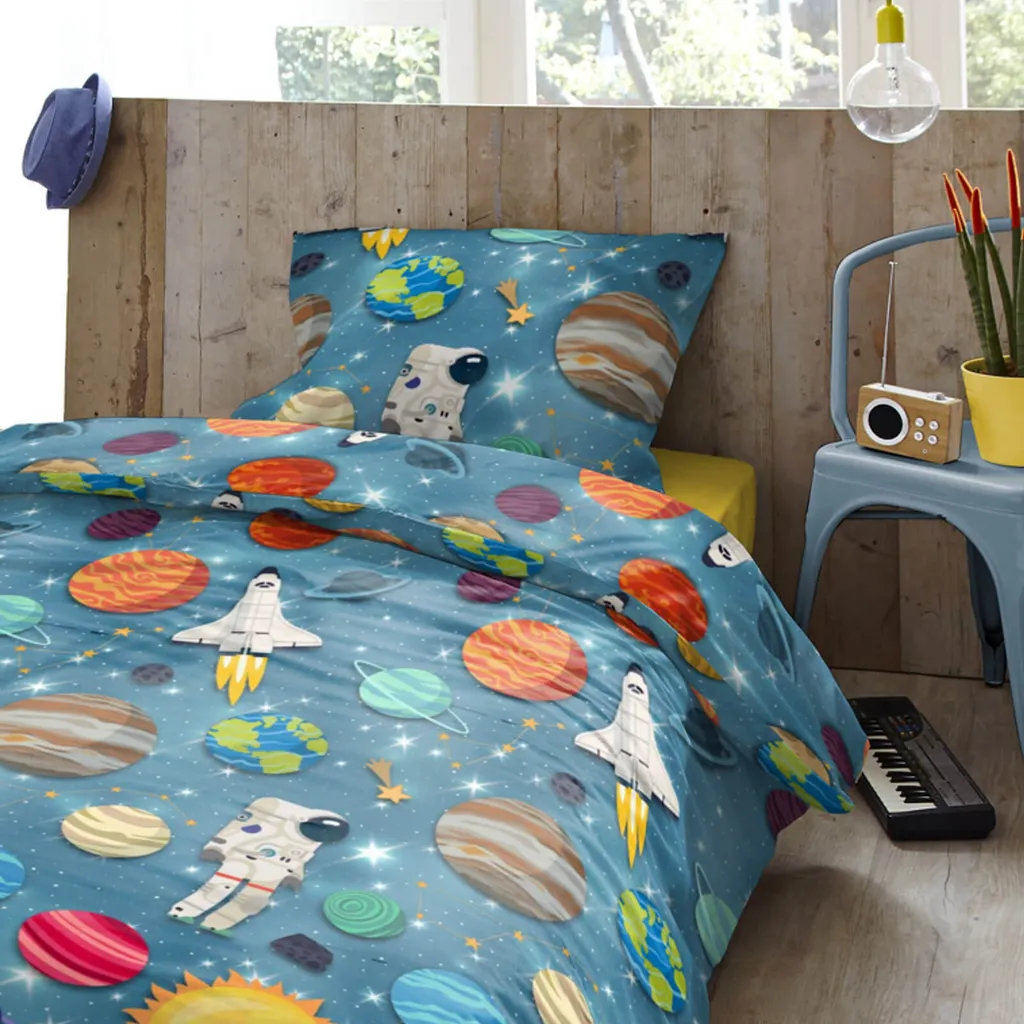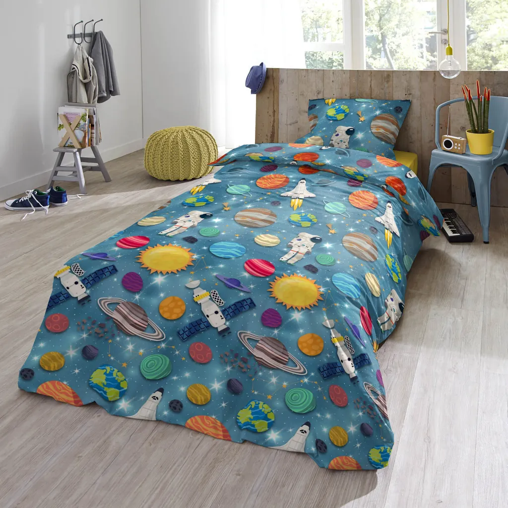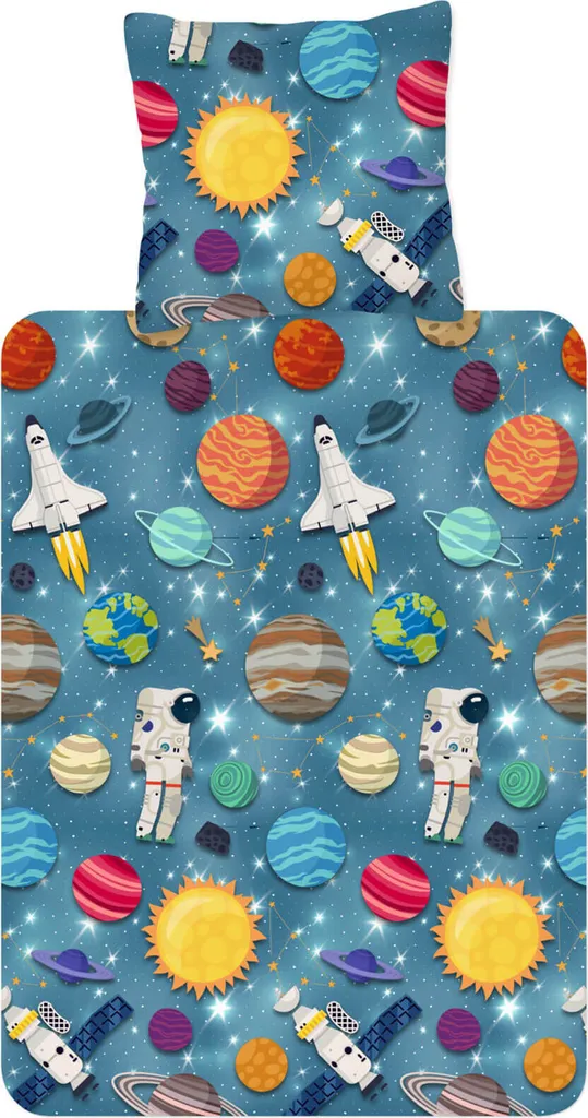 Три, два, один...! С этим галактическим постельным бельем из коллекции Trendy Bedding от ESPiCO маленькие астронавты смогут исследовать бескрайние просторы космоса! Ракеты с реактивными двигателями проносятся сквозь космос, мимо Земли, Марса и Сатурна, перенося маленьких астронавтов к далеким галактикам и морю мерцающих звезд. Благодаря пушистой, мягкой и приятной на ощупь теплой фланелевой поверхности этот комплект постельного белья станет идеальным спутником для морозных зимних ночей. Чтобы сохранить качество цвета, яркие изделия необходимо стирать при температуре, указанной на этикетке по уходу в течение первых нескольких стирок. Декоративные элементы, показанные на рисунке, в комплект не входят. Различные настройки экрана могут привести к небольшим отклонениям в цвете по сравнению с оригинальным изделием. Этот приятный для кожи, теплый и уютный зимний комплект постельного белья из 2 предметов изготовлен из 100% хлопковой фланели и украшен ракетами, планетами и созвездиями. Мягкое и пушистое постельное белье для детей и подростков с космическими мотивами, такими как спутники, Земля, Марс, Сатурн, Юпитер, астронавты, космические корабли и сияющие звезды. Дышащее, влагорегулирующее, впитывающее, подходит для любого сезона и станет идеальным подарком для юных исследователей космоса и астрономов-любителей. Стандарт 100, номер теста 2012PK0106 AITEX, стирать вывернутым наизнанку с застежкой-молнией при температуре 40 градусов, можно сушить в стиральной машине, гладить при средней температуре. Состав: 1 комплект зимнего постельного белья, состоящий из пододеяльника (135x200 см) и наволочки (80x80 см) для односпальной кровати, с практичной застежкой-молнией.