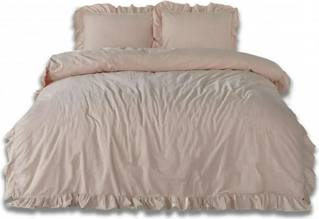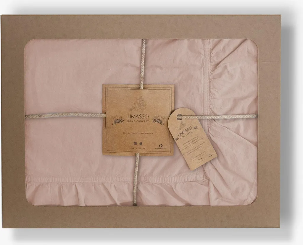 Комплекты постельного белья изготовлены из 100% высококачественного хлопка. Эта ткань нежная и мягкая на ощупь. Постельное белье элегантно отделано воланом и двойной строчкой. Пододеяльник застегивается на пуговицы, а наволочки имеют отвороты. Весь комплект упакован в экологичную коробку.