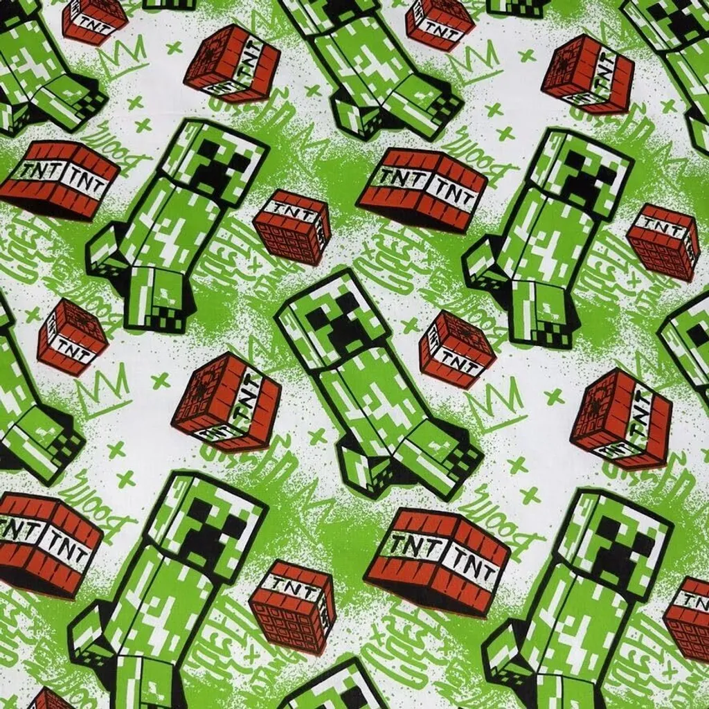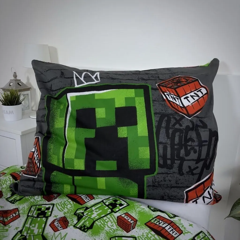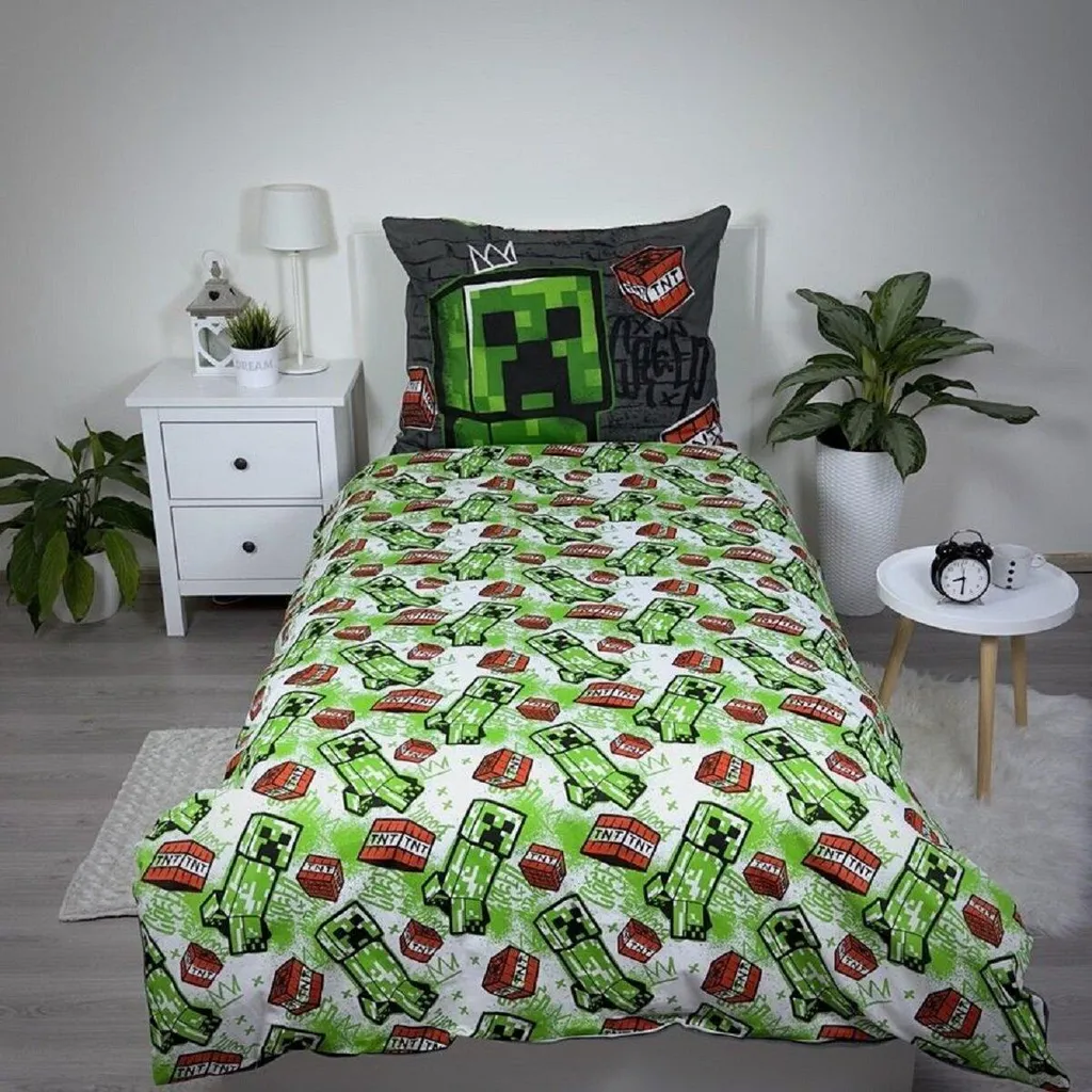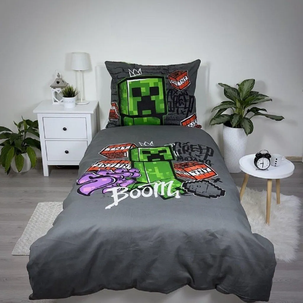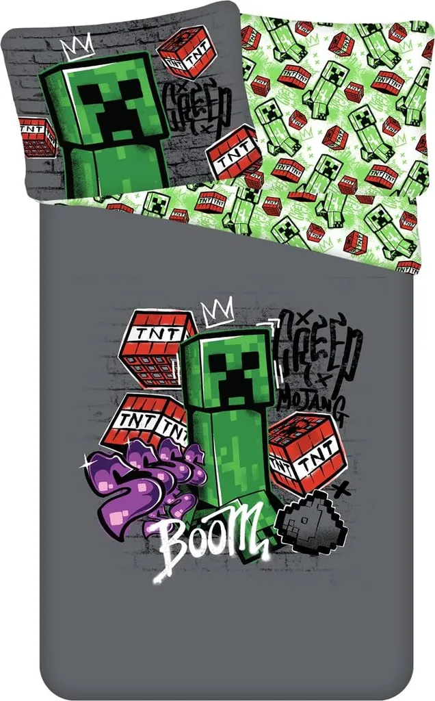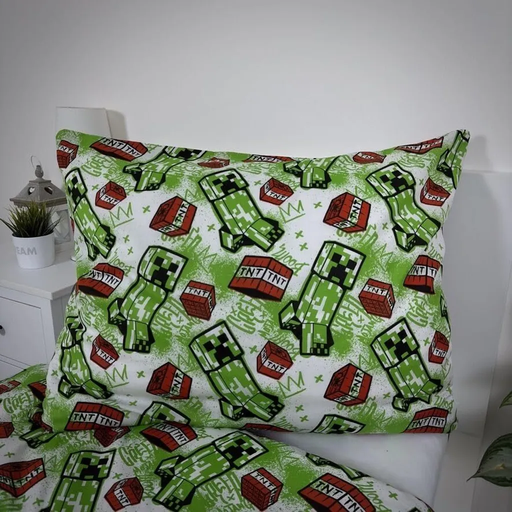 Компьютерная игра Minecraft была продана тиражом более 235 миллионов копий на сегодняшний день, что делает ее самой продаваемой компьютерной игрой всех времен. В основе игры лежит сбор ресурсов, строительство собственных построек и устройств, а также сражение с надоедливыми монстрами. Благодаря всемирной популярности мотивы Minecraft теперь украшают бесчисленное количество текстиля, включая этот комплект постельного белья. Младенцы, малыши и взрослые будут в восторге от этого постельного белья! Это фантастическое постельное белье с изображением культовых персонажей Minecraft станет настоящей приманкой для глаз в любой детской комнате. Оно превратит скучную кровать в уютное убежище. Легкий материал пододеяльника и наволочки приятно мягкий и уютный, идеально подходит для того, чтобы дети уютно устроились в нем. Этот комплект постельного белья - абсолютный must-have для маленьких поклонников классических компьютерных игровых тем. Комплект состоит из наволочки (70 x 90 см) и пододеяльника (140 x 200 см). Наволочка и пододеяльник украшены знакомым зеленым крипером ТНТ из популярной игры Minecraft, появляющимся со своими тротиловыми бомбами. Под пододеяльником под зеленым крипером ТНТ написано слово Бум, а на обратной стороне изображено множество разных зеленых криперов. Это постельное белье не только для фанатов компьютерных игр - оно обязательно подарит сладкие сны!