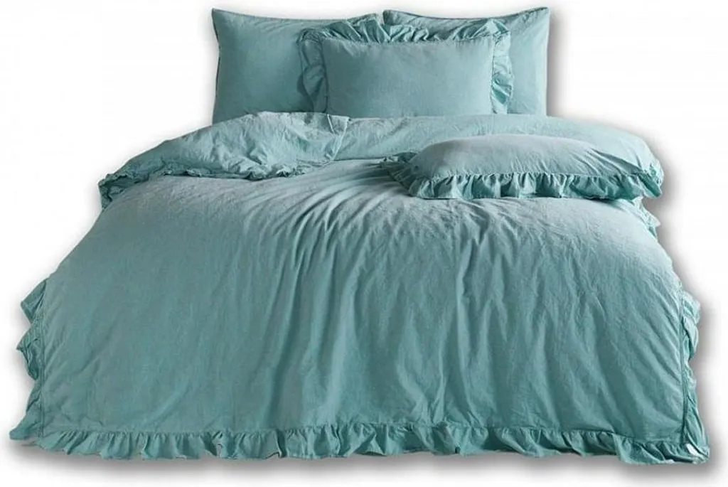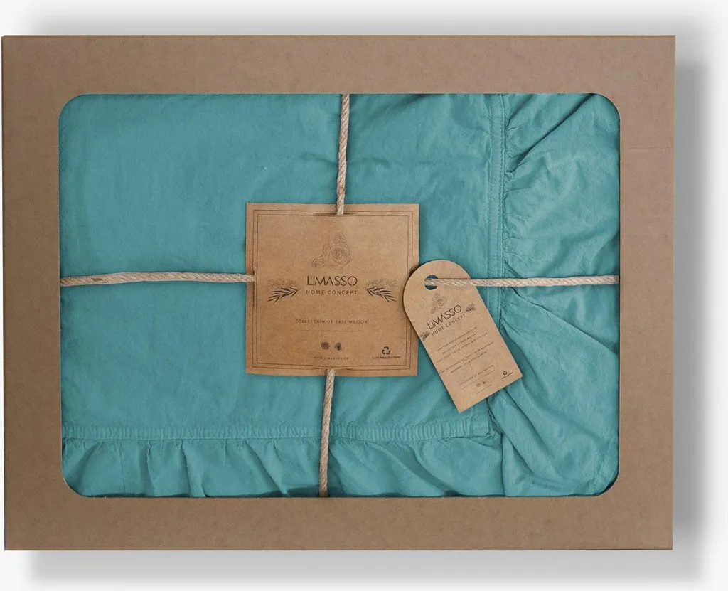 Комплекты постельного белья изготовлены из 100% высококачественного хлопка. Эта ткань нежная и мягкая на ощупь. Постельное белье элегантно отделано воланом и двойной строчкой. Пододеяльник застегивается на пуговицы, а наволочки имеют отвороты. Весь комплект упакован в экологичную коробку.