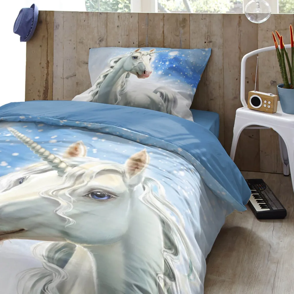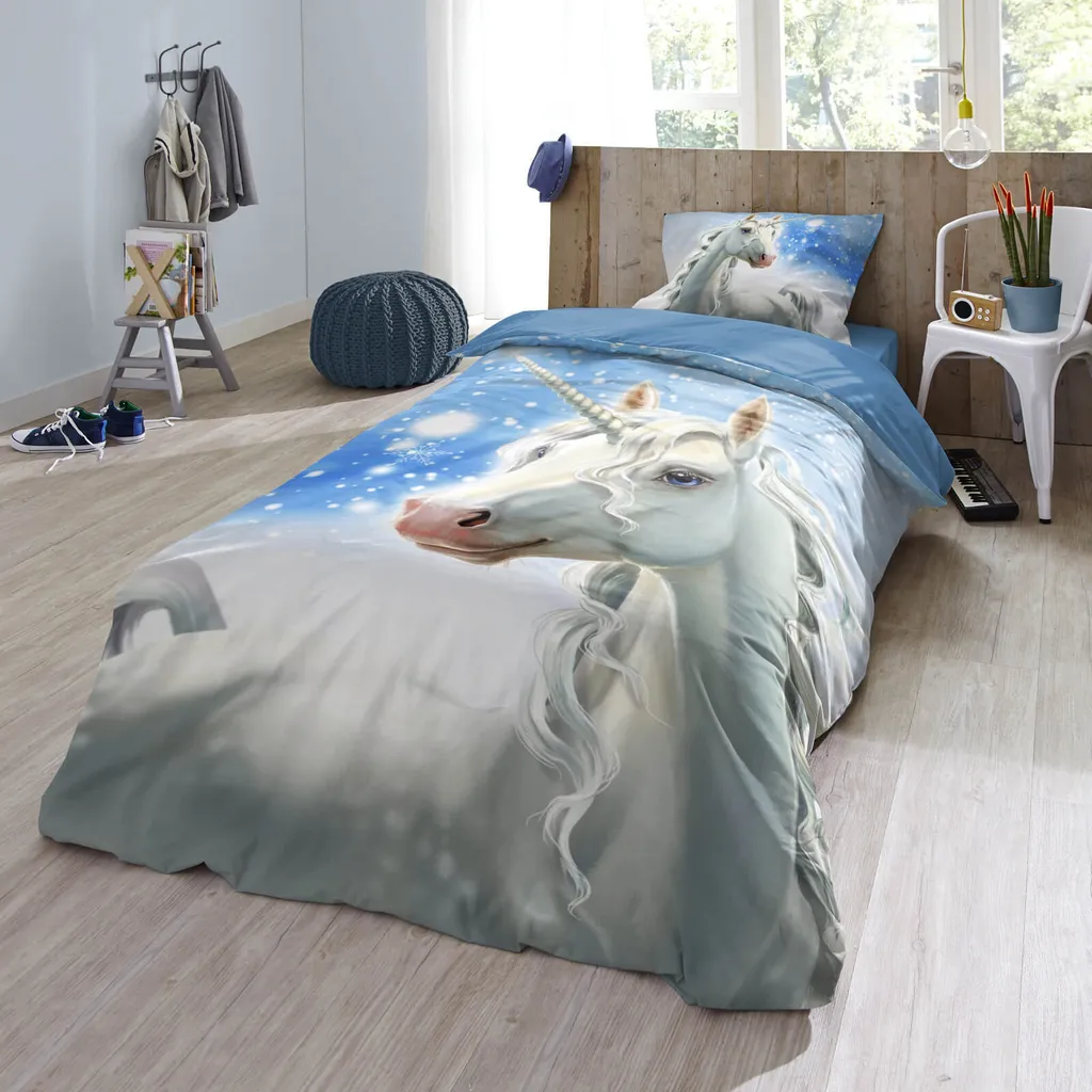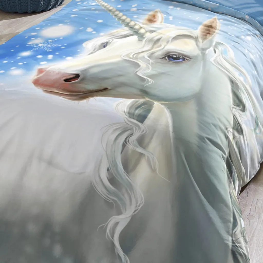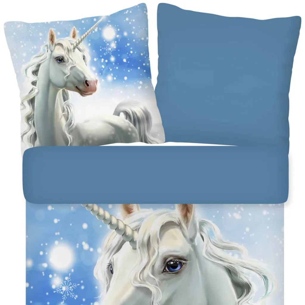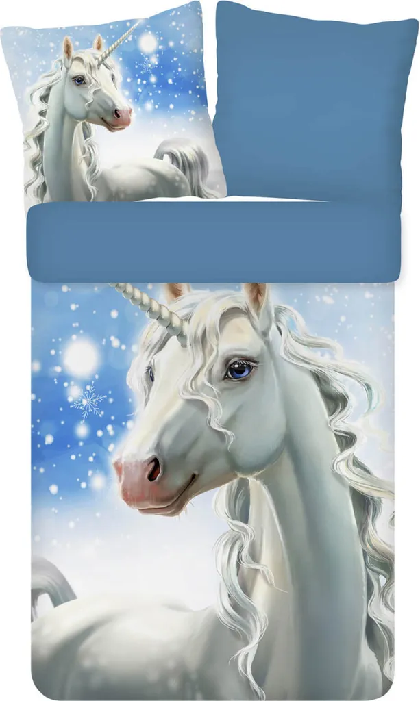 Девичьи мечты сбываются! Это очаровательное постельное белье из коллекции Trendy Bedding от ESPiCO заставит трепетать сердце любой девочки. Грациозный единорог распыляет ледяные кристаллы, превращая пейзаж в зимнюю сказку. Изнаночная сторона пододеяльника насыщенного синего цвета идеально дополняет атмосферу сказки. Мягкая, гладкая и уютная поверхность из 100% хлопка создает идеальные условия для уютного отдыха. Благодаря пушистой, мягкой и теплой фланелевой поверхности этот комплект постельного белья станет идеальным спутником для морозных зимних ночей. Чтобы сохранить качество цвета, яркие изделия следует стирать при температуре, указанной на этикетке, в течение первых нескольких стирок и не ниже. Декоративные элементы, изображенные на фотографии, в комплект не входят. Различные настройки экрана могут привести к незначительному изменению цвета по сравнению с оригиналом. Этот теплый, приятный на ощупь зимний комплект постельного белья из 100% хлопковой фланели состоит из двух частей. Он выполнен из 100% хлопковой фланели и украшен сказочным единорогом. Мягкое, пушистое, двустороннее постельное белье для детей и подростков с изображением белого единорога на фоне заснеженного пейзажа и однотонной синей изнанкой. Дышащее, влагорегулирующее, впитывающее и подходящее для холодной зимы, оно поможет маленьким принцессам мечтать. Стандарт 100, номер теста 2012PK0106 AITEX, стирать вывернутым наизнанку с застежкой-молнией при температуре 40 градусов, можно сушить в стиральной машине, гладить при средней температуре. Состав: 1 комплект зимнего постельного белья, состоящий из пододеяльника (135 x 200 см) и наволочки (80 x 80 см) для односпальной кровати, с практичной застежкой-молнией.