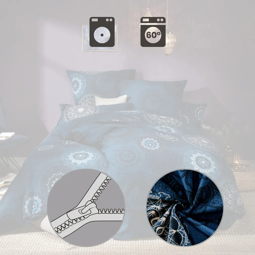 Erwin Müller Фланелевое постельное белье премиум-класса. Изысканные мандалы в гармоничной цветовой гамме обогатят вашу атмосферу и притянут взгляд. Они располагают к мечтам и отдыху. С двусторонней наволочкой. Наслаждайтесь нежным, бархатистым постельным бельем из тонкой пряжи в прохладные месяцы. Оно согревает, регулирует температуру и дышит. Легко надевать благодаря экономящей время молнии.