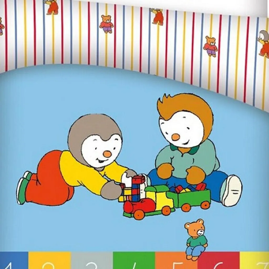 На пододеяльнике изображен Тчупи, играющий со своим другом в своей комнате. На другой стороне пододеяльника изображены несколько маленьких фигурок Тчупи, пронумерованных от 1 до 6. На наволочке также изображен Тчупи, а на каждой подушке есть полоска с четырехзначным номером. Двустороннее постельное белье T'choupi - 140 см x 200 см - Состав: - 1 пододеяльник T'choupi 140 см x 200 см - 1 наволочка T'choupi 65 см x 65 см - Двустороннее - 2 дизайна в одном - Материал: 100% хлопок - Уход: машинная стирка 60 °C
