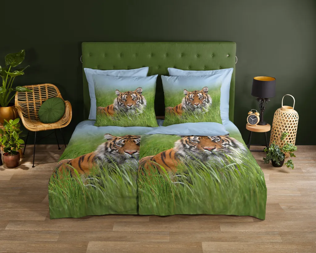 Пододеяльник Silence от Good Morning с тигровым принтом, в цвете Multi, изготовлен из 100% хлопка. Этот материал дышащий, влагоотводящий, мягкий и гладкий на ощупь. Этот красивый пододеяльник украсит любую спальню и подойдет для любого сезона. Хлопковый пододеяльник прохладный летом и теплый зимой. Комплект состоит из одного пододеяльника (135x200 см) и одной наволочки (80x80 см) с застежкой-молнией YKK. Стирать при температуре не более 40°C и сушить в стиральной машине. Постельное белье марки Good Morning изготовлено из 100% хлопка (перкаль). Материал можно стирать в стиральной машине при температуре до 40°C, а наволочка и пододеяльник застегиваются на молнии. Изнаночная сторона постельного белья подобранна в тон цвета. Величественный, мощный и успокаивающий одновременно - комплект постельного белья Good Morning Silence перенесет красоту дикой природы прямо в вашу спальню благодаря впечатляющему тигриному мотиву. Завораживающий взгляд тигра, выглядывающего из высокой травы, придает дизайну таинственную и в то же время успокаивающую атмосферу. Мягкий переход от сочной зелени травы к небесно-голубому фону гармонично дополняет дизайн. Это постельное белье из 100% высококачественного хлопка дарит коже удивительно мягкие ощущения, дышащее и обеспечивает максимальный комфорт во время сна. Практичная молния позволяет легко менять простыни и обеспечивает идеальную посадку.