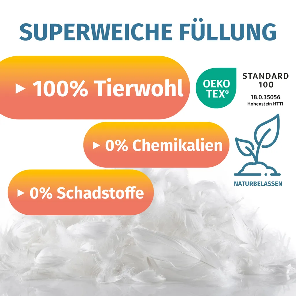 Для оптимального ухода одеяло можно стирать при температуре до 60°C - но только деликатными моющими средствами или моющими средствами для пуха. Чтобы сохранить его пушистость, его следует сушить в стиральной машине только с использованием шариков для сушки. Пожалуйста, ознакомьтесь с инструкциями по уходу на этикетке.