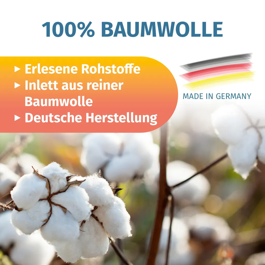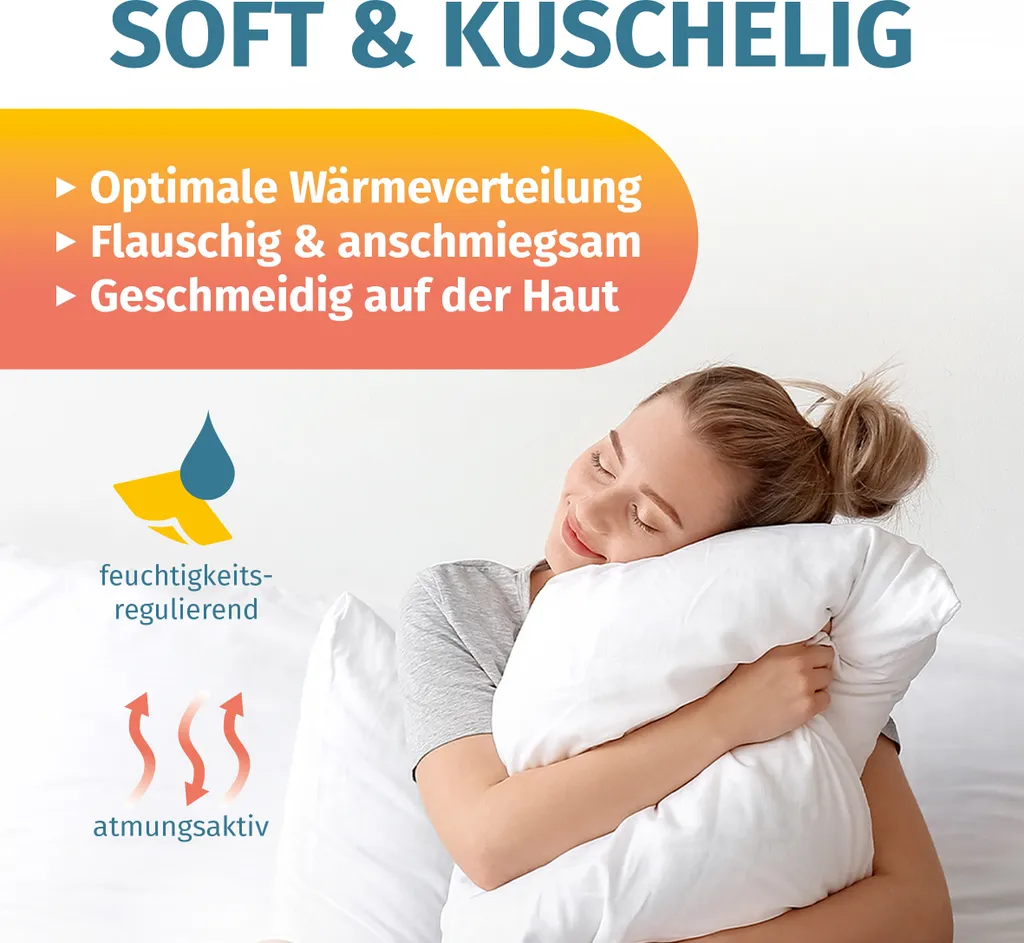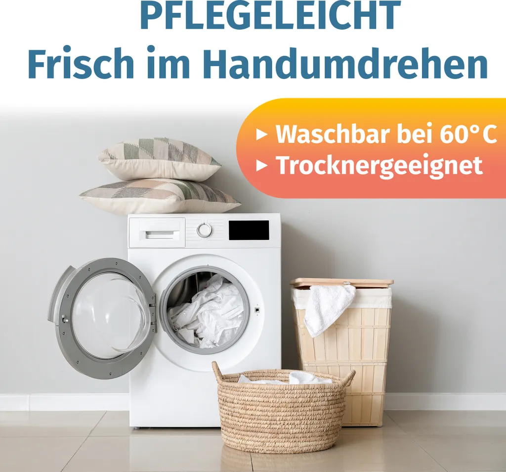 Для оптимального ухода одеяло можно стирать при температуре до 60°C - но только деликатными моющими средствами или моющими средствами для пуха. Чтобы сохранить его пушистость, его следует сушить в стиральной машине только с использованием шариков для сушки. Пожалуйста, ознакомьтесь с инструкциями по уходу на этикетке.