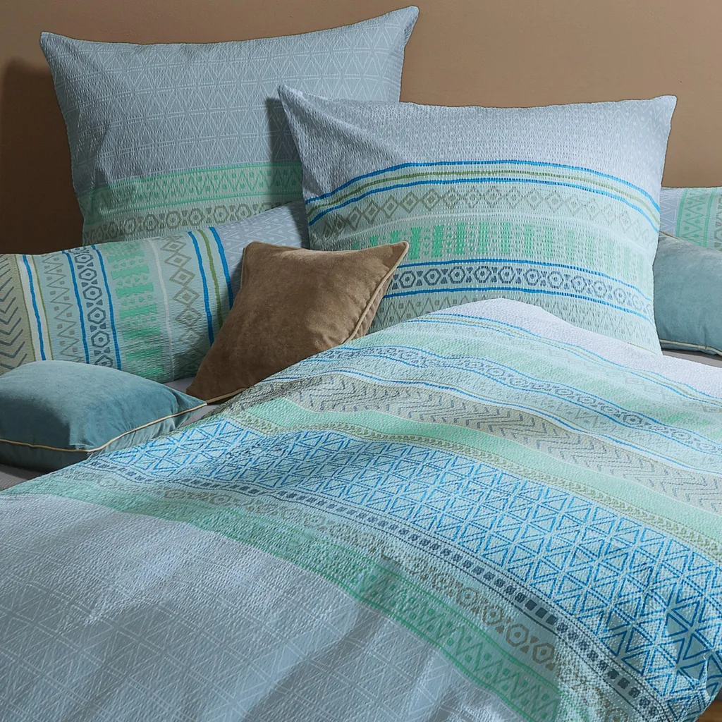 Постельное белье Erwin Müller из сирсакера. Разнообразные этнические узоры - от нежных до ярких - украшают этот очаровательный дизайн, наполняя вашу спальню глотком свежего воздуха. Двусторонняя наволочка добавит еще больше индивидуальности. Особенно летом вы оцените его приятную легкость, приятный для кожи и терморегулирующий эффект благодаря долговечной жатой текстуре. Он прост в использовании, быстро сохнет, не мнется, а благодаря молнии чехол можно быстро поменять.