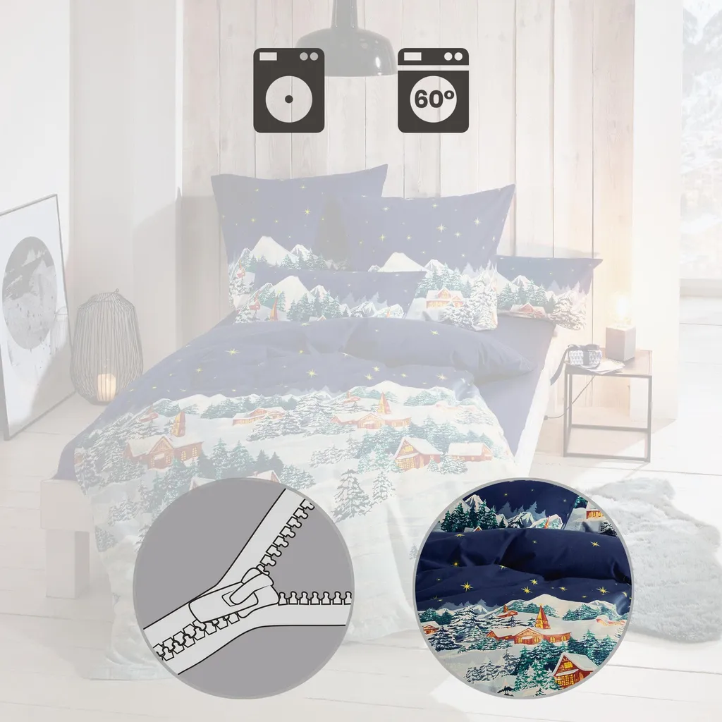 Erwin Müller Изящное фланелевое постельное белье. Заснеженная зимняя деревня излучает настоящий уют. Оно создает в вашей спальне уютную атмосферу и располагает к мечтам. Холодными зимними ночами бархатисто-мягкий, уютный и теплый ворс обеспечит комфорт. Мягкая, дышащая и терморегулирующая ткань - настоящее удовольствие для кожи. Быстро и легко надевается благодаря практичной молнии.