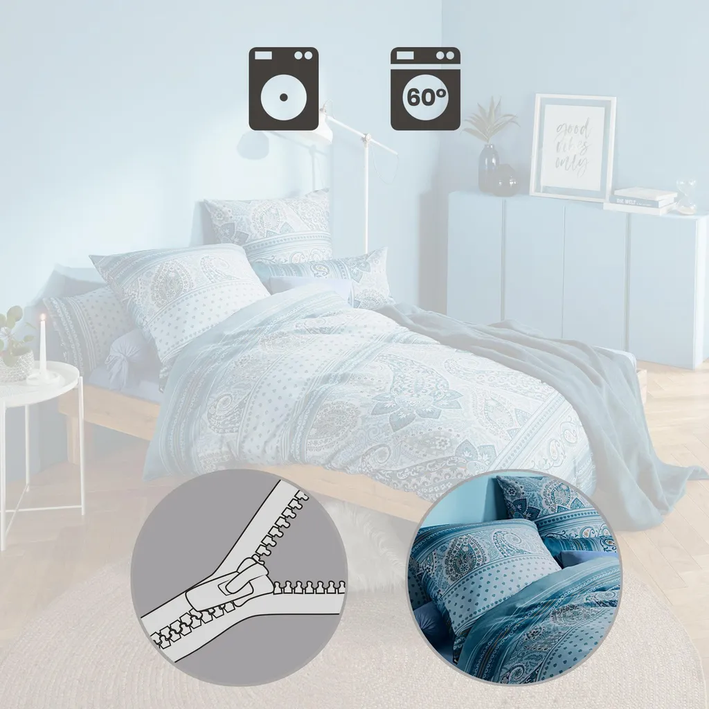 Постельное белье Erwin Müller Mako из сатина. Элегантный узор пейсли и красивые горизонтальные полосы в гармонично подобранных тонах придадут вашей спальне стиль и изысканность. В комплект входит двусторонняя наволочка. С первого прикосновения вы будете очарованы этой тонкой, бархатистой тканью. Она соблазняет своим изысканным блеском и окутывает вас волшебным сном. Кроме того, она терморегулирует, дышащая и мягкая на ощупь. Практичная застежка-молния обеспечивает легкую смену чехла.