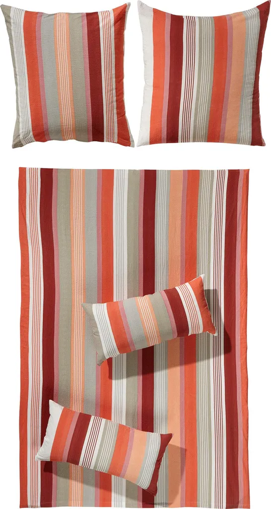 Постельное белье из сирсакера Erwin Müller. Яркие полосы в гармоничном цветовом сочетании придают этому современному комплекту особое очарование. Эта воздушная, легкая, приятная для кожи и терморегулирующая ткань с устойчивым жатым эффектом обеспечивает оптимальную циркуляцию воздуха, особенно летом. Вам также понравятся простота ухода, быстрое высыхание и отсутствие складок. Легко надевать благодаря практичной молнии.