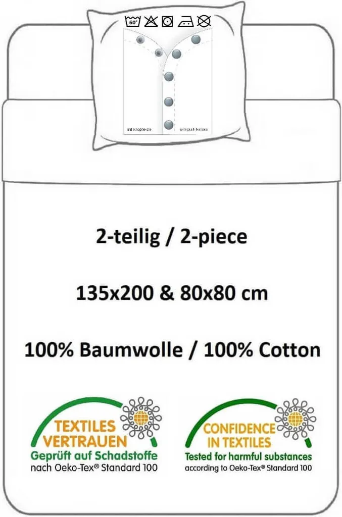 ИНСТРУКЦИИ ПО УХОДУ - Перед первым использованием постирайте комплект постельного белья отдельно при температуре 60 °C. Обычная стирка, в закрытом виде, вывернув наизнанку. Не отбеливать, не сушить в стиральной машине, не гладить при средней температуре, не подвергать химчистке. ИДЕЯ ДЛЯ ПОДАРКА - Комплект постельного белья станет идеальным подарком детям, подросткам и взрослым на день рождения, Рождество, Пасху или в качестве небольшого презента. Пододеяльник с разноцветной лицевой стороной украшен логотипом Ford Mustang. Изнаночная сторона нейтральная, с серыми логотипами Mustang. На наволочке также изображен логотип Mustang и надпись FORD MUSTANG. Комплект постельного белья изготовлен из 100% хлопка и легко стирается в стиральной машине при температуре 60 градусов в обычном режиме. Это дышащее, влагорегулирующее, впитывающее и прочное двустороннее постельное белье можно использовать весной, летом, осенью и зимой, обеспечивая идеальные условия для уютного и комфортного сна. Покрывала немецкого размера 135x200 см (пододеяльник) и 80x80 см (наволочка) подходят для односпальных кроватей детей, подростков и взрослых, обеспечивая им полноценный и спокойный сон. Позвольте себе насладиться сновидениями и максимальным комфортом сна с этим терморегулирующим, дышащим и приятным для кожи постельным бельем. Тема: Ford Mustang; Цвет: оттенки серо-красного; Дизайн: Двусторонний винтажный мотив; Материал: 100% хлопок: стандарт 100 Hohenstein**; Размеры: 135 x 200 см (пододеяльник), 80 x 80 см (наволочка); Застежка: пуговицы; Инструкции по уходу: можно стирать в стиральной машине и сушить в сушильной машине; Комплект поставки: 1 пододеяльник, 1 наволочка.