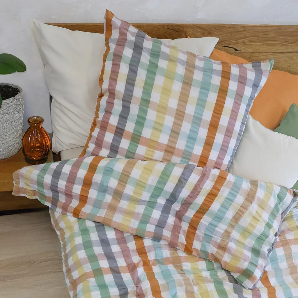Мягкое постельное белье с нежными жатыми полосками идеально подходит для того, чтобы уютно устроиться в нем. Дышащий, простой в уходе и терморегулирующий хлопковый материал - это настоящий плюс. Воздушный дизайн делает это постельное белье идеальным для лета.