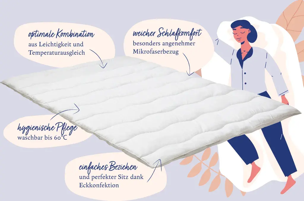 В то же время, Чехол из микрофибры придает одеялу особую мягкость и комфортный сон. Микрофибра хорошо впитывает влагу и быстро отдает ее обратно в окружающую среду. В сочетании с воздушным наполнителем стеганое одеяло очень легкое. Тем не менее, оно хорошо сохраняет тепло, не вызывая перегрева. Мягкая волнистая простежка обеспечивает надежную фиксацию терморегулирующего наполнителя одеяла. Благодаря углам 90 градусов стеганое одеяло легко надевать на постельное белье и оно идеально садится по фигуре. Стеганое одеяло особенно гигиенично, его можно стирать при температуре до 60 °C и сушить в стиральной машине. Поэтому оно также рекомендуется людям с аллергией на пылевых клещей. Стеганое одеяло состоит из двух отдельных одеял (летнего и переходного), которые можно сшить вместе, чтобы создать зимнее одеяло. Конструкция, рассчитанная на все 4 сезона, обеспечивает идеальный комфорт для сна круглый год.