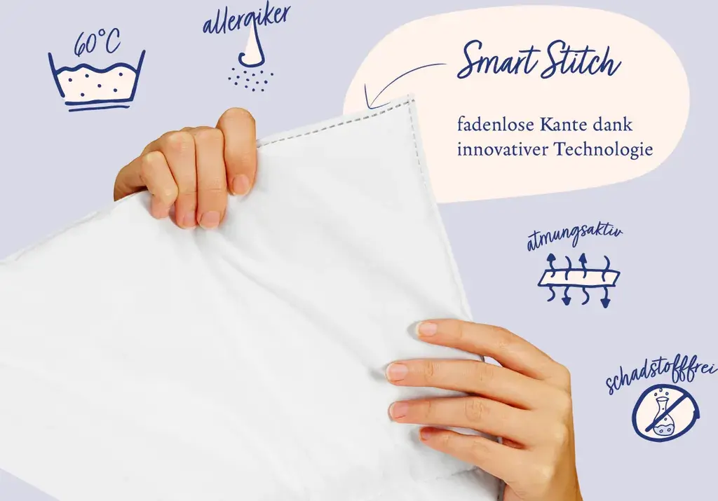 В то же время, Чехол из микрофибры придает одеялу особую мягкость и комфортный сон. Микрофибра хорошо впитывает влагу и быстро отдает ее обратно в окружающую среду. В сочетании с воздушным наполнителем стеганое одеяло очень легкое. Тем не менее, оно хорошо сохраняет тепло, не вызывая перегрева. Мягкая волнистая простежка обеспечивает надежную фиксацию терморегулирующего наполнителя одеяла. Благодаря углам 90 градусов стеганое одеяло легко надевать на постельное белье и оно идеально садится по фигуре. Стеганое одеяло особенно гигиенично, его можно стирать при температуре до 60 °C и сушить в стиральной машине. Поэтому оно также рекомендуется людям с аллергией на пылевых клещей. Стеганое одеяло состоит из двух отдельных одеял (летнего и переходного), которые можно сшить вместе, чтобы создать зимнее одеяло. Конструкция, рассчитанная на все 4 сезона, обеспечивает идеальный комфорт для сна круглый год.