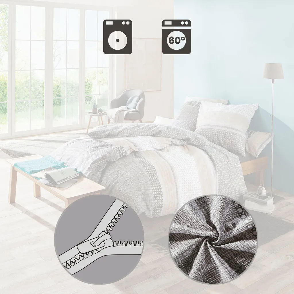 Постельное белье из сирсакера Erwin Müller. Графичный полосатый рисунок, гармоничные цвета и двусторонняя наволочка наполнят ваш дом свежестью. Вас быстро поразит простота ухода: это простое постельное белье практически не мнется - просто постирайте, высушите и благодаря молнии мгновенно положите его обратно на кровать.
