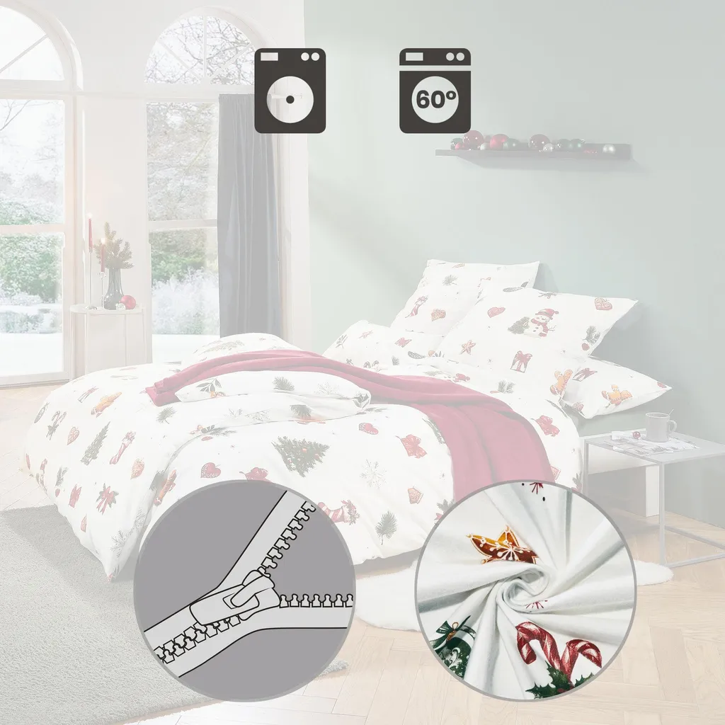 Erwin Müller Постельное белье из фланели премиум-класса. Рождественские мотивы, такие как пряничные человечки, елки, снеговики и другие, создадут уютную атмосферу в вашей спальне. Мягкая начесная поверхность ткани дарит ощущение бархатистости, а ее качество обеспечивает приятное тепло и комфорт. Вам понравится уютно укутываться в эту дышащую и терморегулирующую ткань, ведь она приятна для кожи. Быстро и легко надевается благодаря практичной молнии.