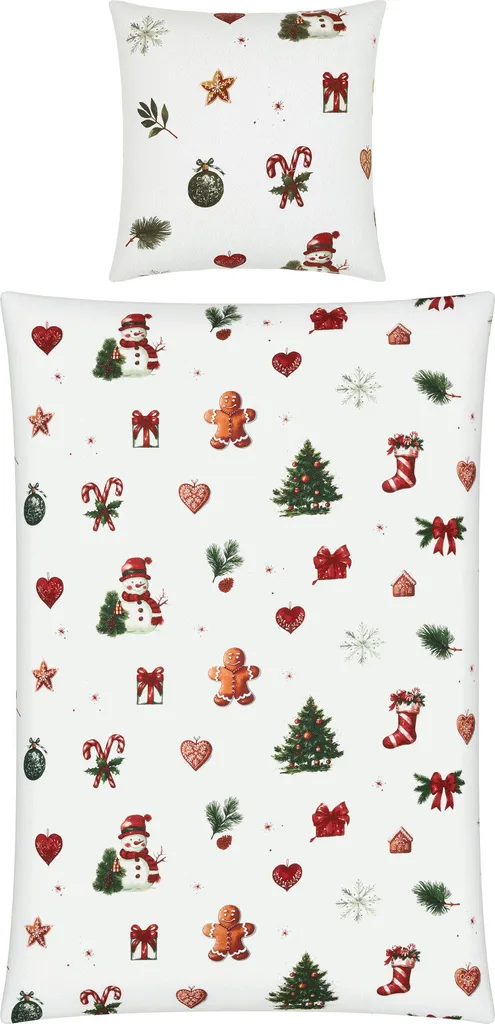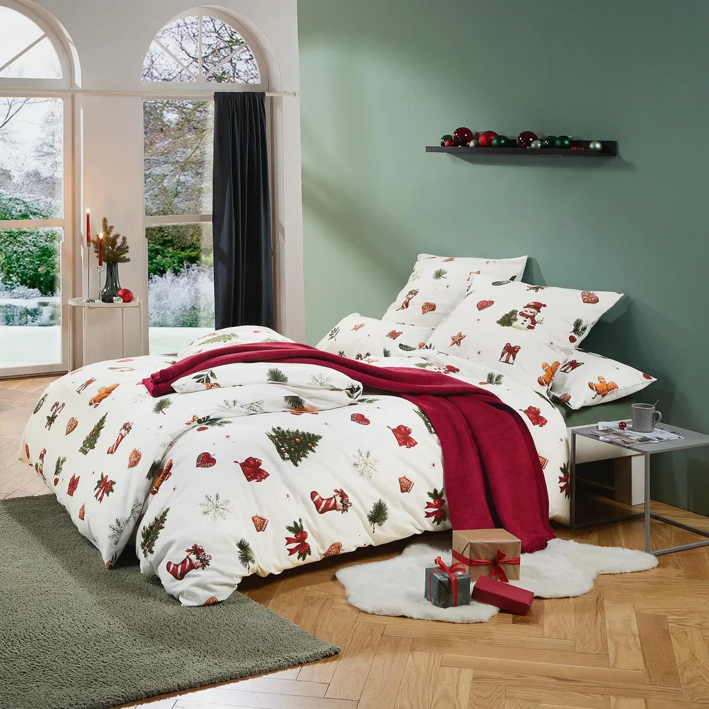 Erwin Müller Постельное белье из фланели премиум-класса. Рождественские мотивы, такие как пряничные человечки, елки, снеговики и другие, создадут уютную атмосферу в вашей спальне. Мягкая начесная поверхность ткани дарит ощущение бархатистости, а ее качество обеспечивает приятное тепло и комфорт. Вам понравится уютно укутываться в эту дышащую и терморегулирующую ткань, ведь она приятна для кожи. Быстро и легко надевается благодаря практичной молнии.