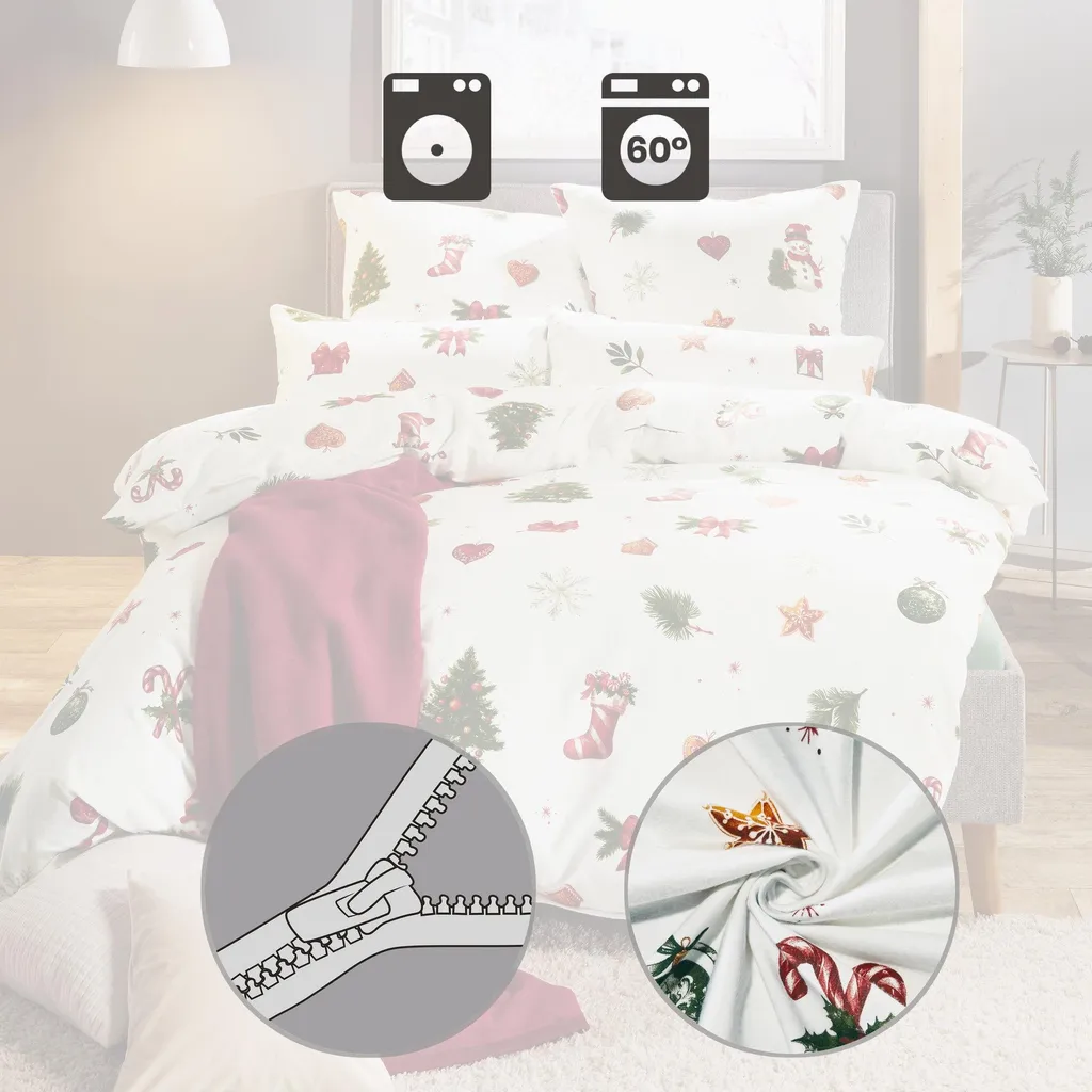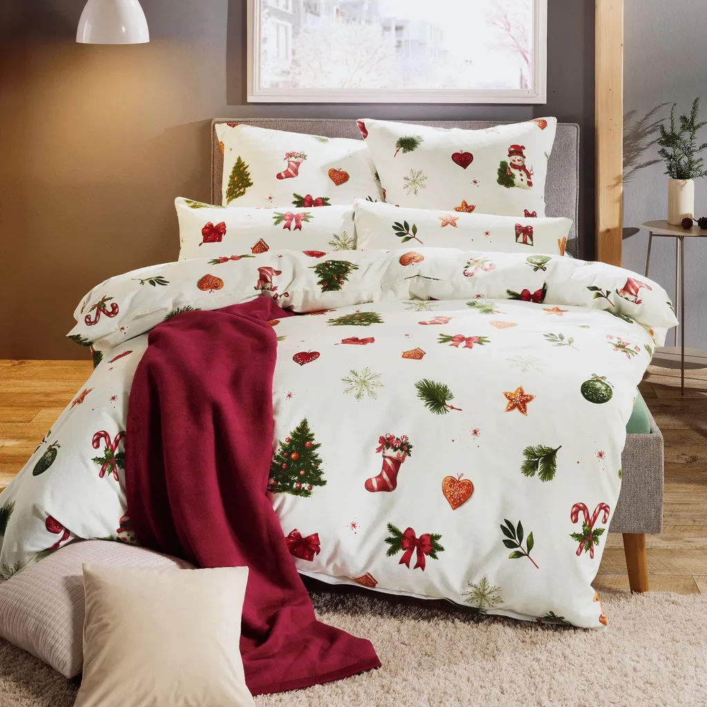 Erwin Müller Постельное белье из фланели премиум-класса. Рождественские мотивы, такие как пряничные человечки, елки, снеговики и другие, создадут уютную атмосферу в вашей спальне. Мягкая начесная поверхность ткани дарит ощущение бархатистости, а ее качество обеспечивает приятное тепло и исключительный комфорт. Вам понравится уютно укутываться в эту дышащую и терморегулирующую ткань, ведь она приятна для кожи. Быстро и легко надевается благодаря практичной молнии.