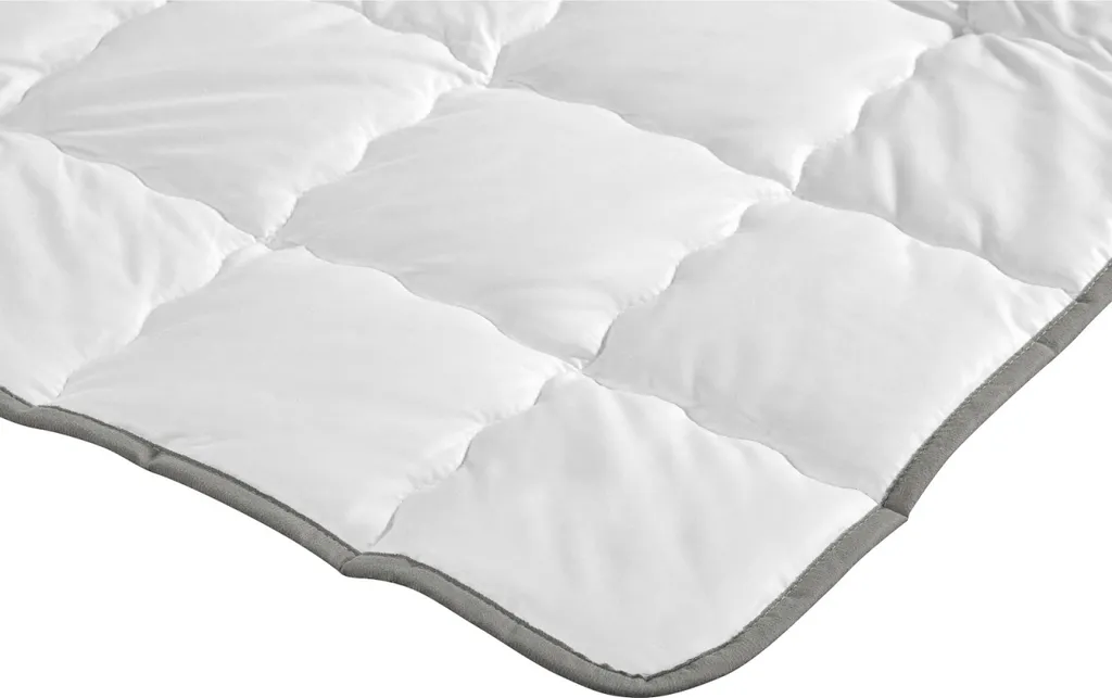 Тонкая стежка летнего одеяла обеспечивает эффективный отвод излишков тепла и предотвращает смещение наполнителя. Серая окантовка стеганого одеяла добавляет привлекательный акцент.
