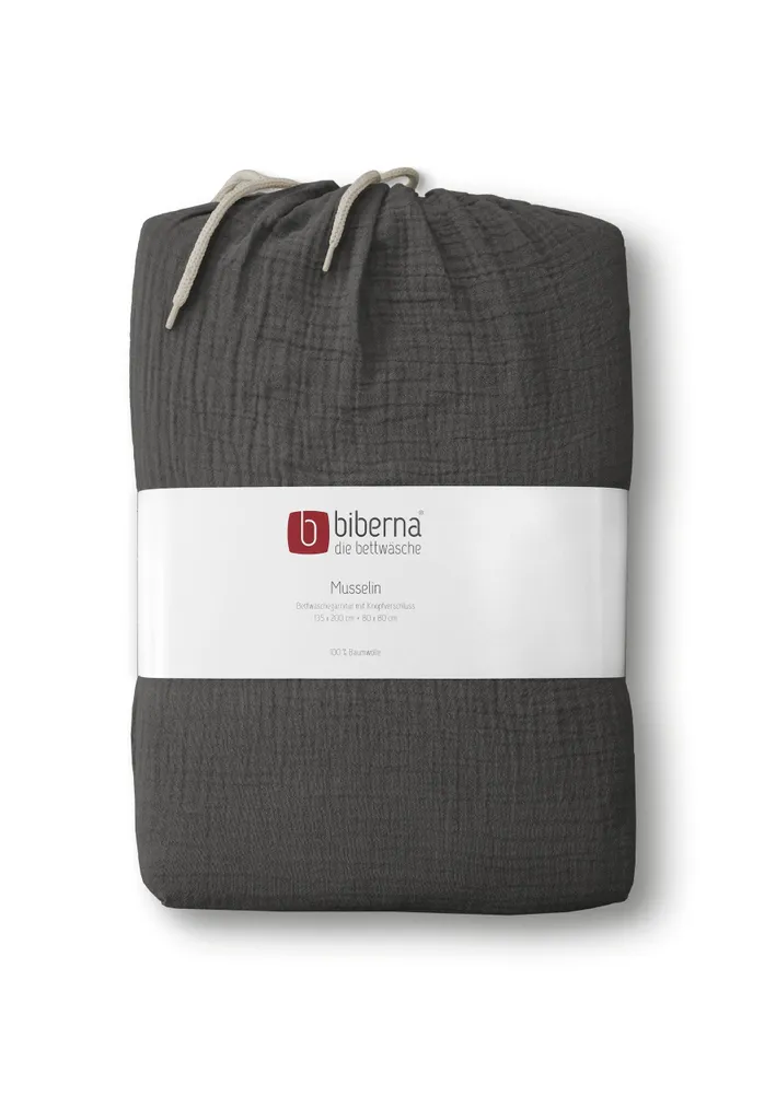 Постельное белье из муслина Biberna изготовлено из 100% хлопка плотностью около 130 г/м². Комплект Biberna можно стирать в обычном режиме при температуре 40°C. Он застегивается на потайные пуговицы. Разрешено отбеливание кислородом и использование обычного стирального порошка. Возможна бережная сушка в стиральной машине на низкой скорости (1 точка).