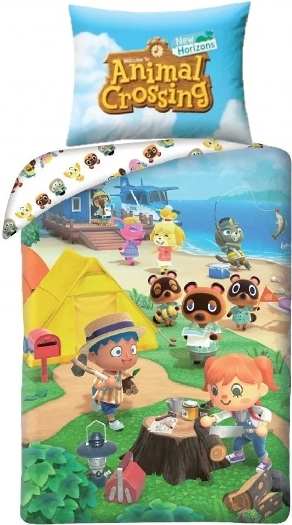 Пододеяльник Animal Crossing, Happy Home. Этот милый односпальный пододеяльник из популярной игры Nintendo Animal Crossing - настоящая находка для поклонников этой веселой игры. В этом фэнтезийном мире вы можете дать волю своему воображению, строя дома и живя с забавными животными в этой деревне. Конечно, есть и время для отдыха, как вы можете видеть на этом пододеяльнике. Кемпинг или рыбалка, все возможно! Пододеяльник напечатан с обеих сторон и поставляется с очень большой наволочкой. Короче говоря: отличный подарок для настоящего поклонника Animal Crossing!