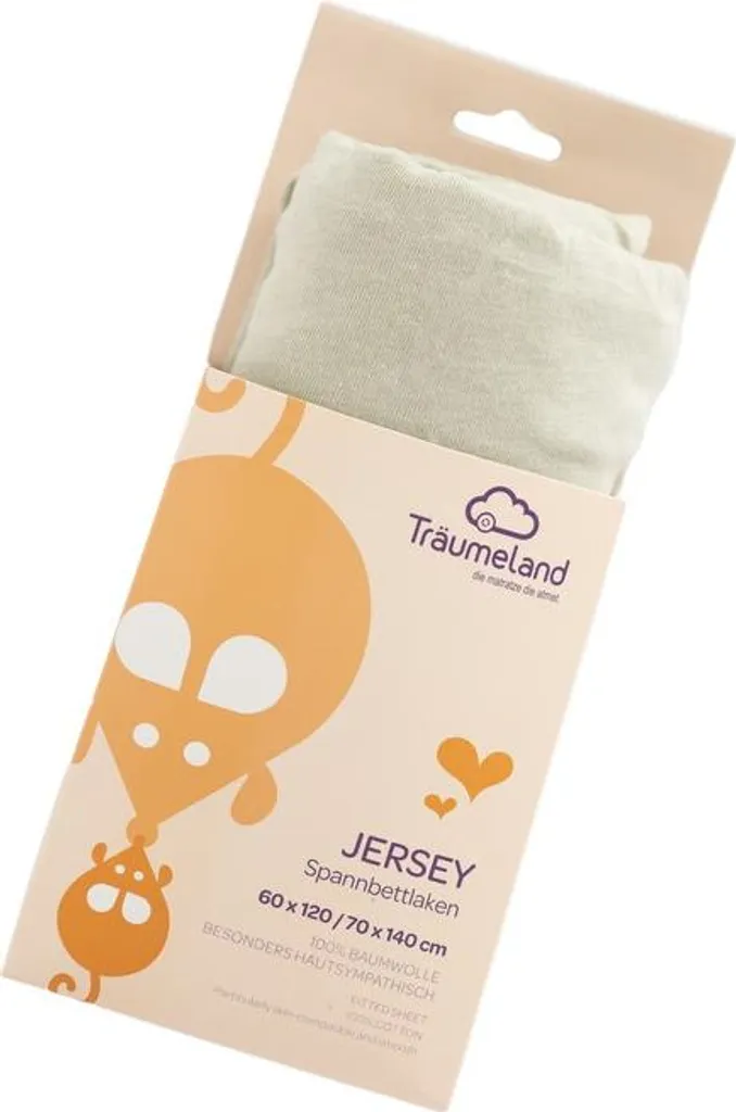 Простыня на резинке Träumeland Jersey: Мягкая и приятная на ощупь трикотажная простыня на резинке от Träumeland, очень приятная на ощупь и эластичная, дышащая и терморегулирующая, с отличной эластичностью и эластичностью, быстро и легко надевается, не мнется благодаря прошитым углам и резинке по всему периметру, не требует глажки. Состав: 100% хлопок. Плотность: 160 г/м².