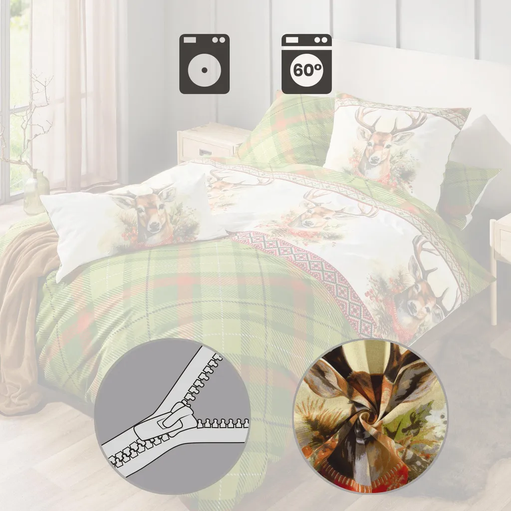 REDBEST Фланелевое постельное белье. Впечатляющие оленьи головы, кайма и классический ромбовидный узор создадут в вашей спальне уютную атмосферу. Двусторонняя наволочка. Мягкая бархатистая ткань с начесом дарит коже приятное тепло и располагает к уютному отдыху - даже холодными ночами. Это качество не только дышащее и терморегулирующее, но также простое в уходе и простое в надевании благодаря молнии.