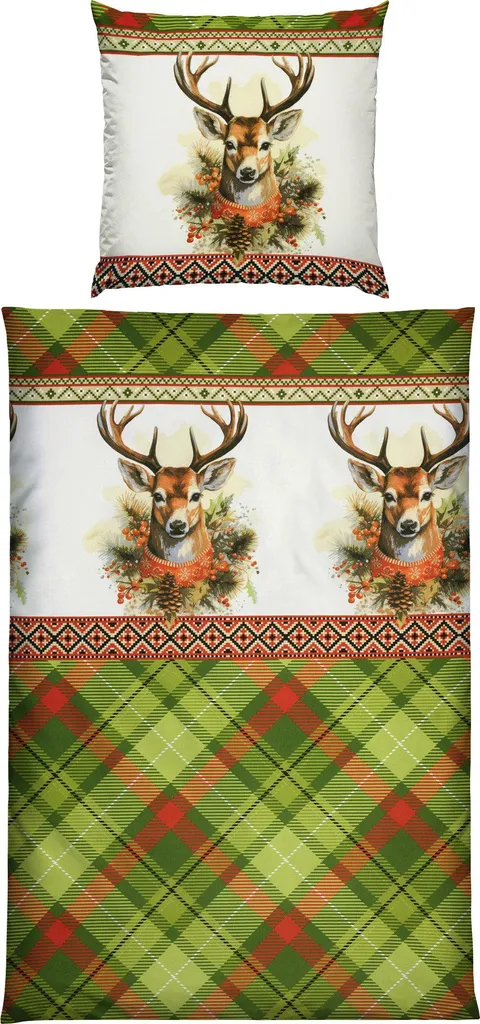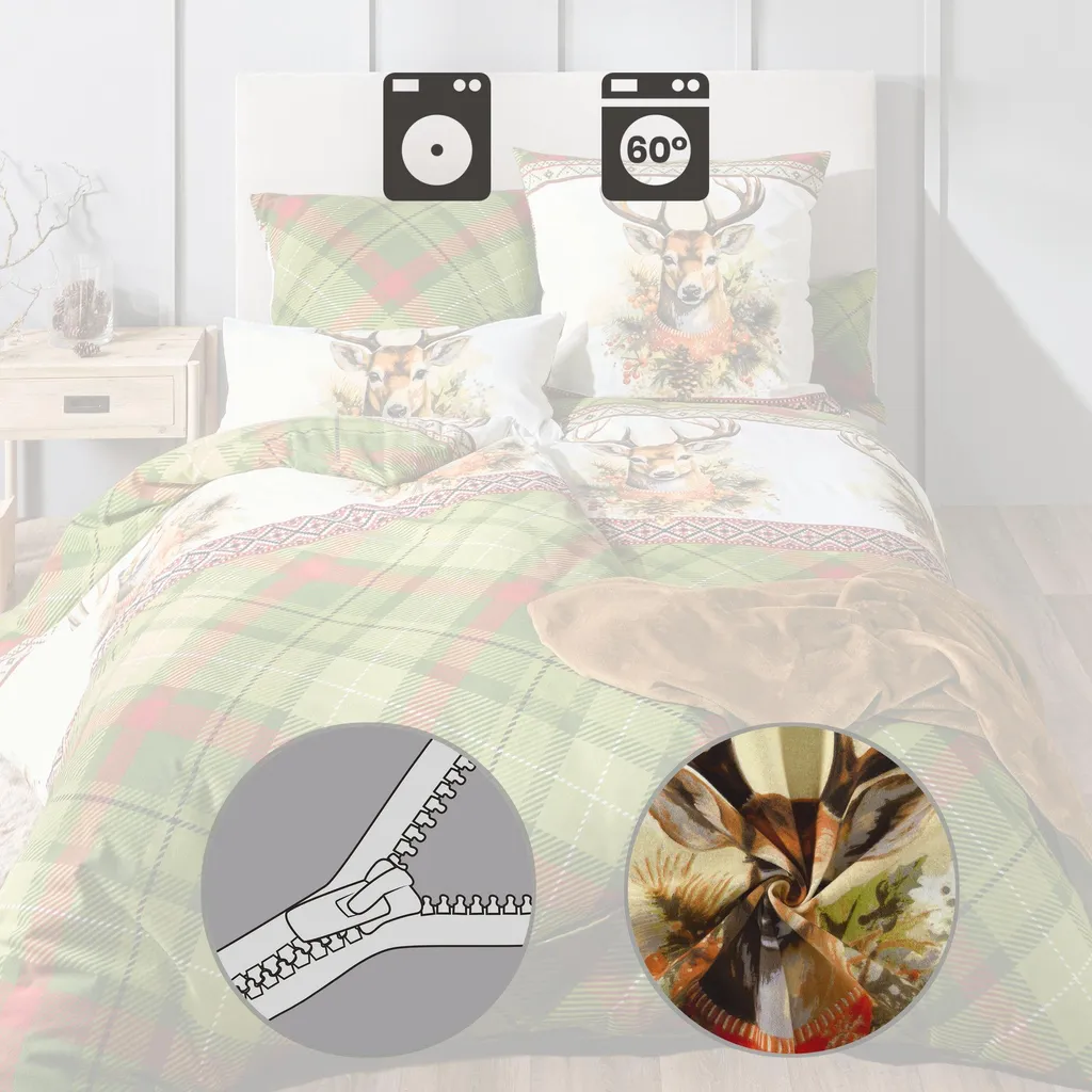 REDBEST Фланелевое постельное белье. Впечатляющие оленьи головы, кайма и классический ромбовидный узор создадут в вашей спальне уютную атмосферу. Двусторонняя наволочка. Мягкая бархатистая ткань с начесом дарит коже приятное тепло и располагает к уютному отдыху - даже холодными ночами. Это качество не только дышащее и терморегулирующее, но также простое в уходе и простое в надевании благодаря молнии.