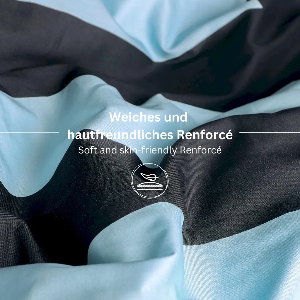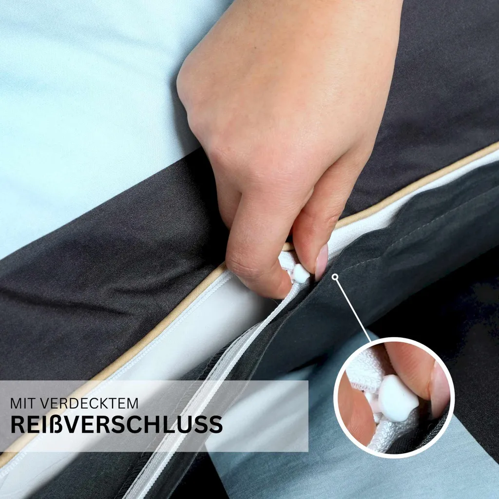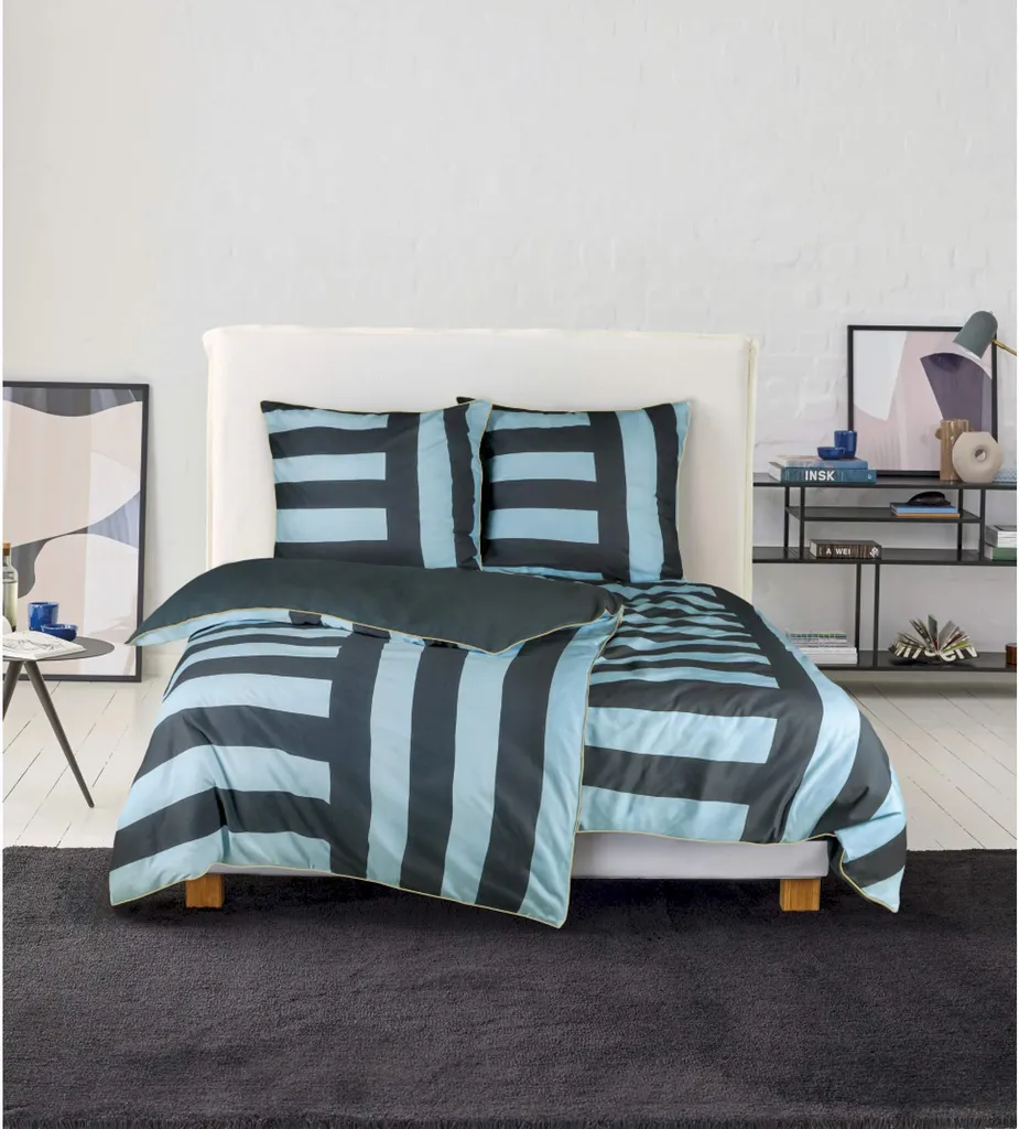 Постельное белье в горизонтальную полоску изготовлено из 100% хлопкового перкаля Better. Узор блочная полоска сочетает в себе вертикальные и горизонтальные полосы, а однотонный темно-серый цвет на изнанке создает ощущение спокойствия. Благодаря плотности нити 144 нити, он сохраняет форму и остается мягким. Обе версии застегиваются на молнию и сочетают в себе стиль, комфорт и экологичность.