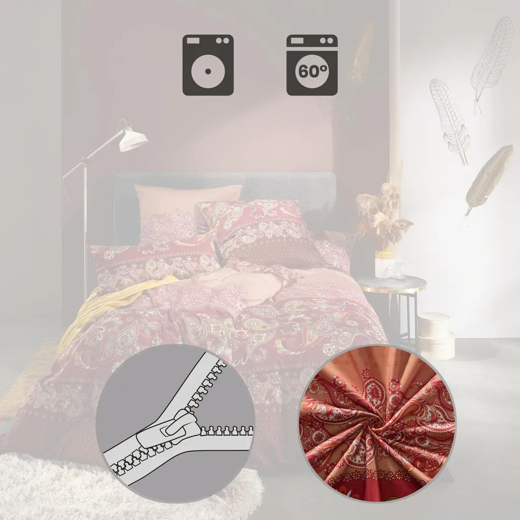 REDBEST Постельное белье из сатина. Поддайтесь чарующему очарованию элегантного узора пейсли. Тонко подобранные цвета придадут вашей спальне стиль и изысканность. С двусторонней наволочкой. Тонкая, чувственная ткань очаровывает изысканным блеском и гладкостью, шелковистостью. Она не только невероятно мягкая на ощупь, но и регулирует влажность, поддерживает температуру и дышит. Легко надевать благодаря практичной молнии.