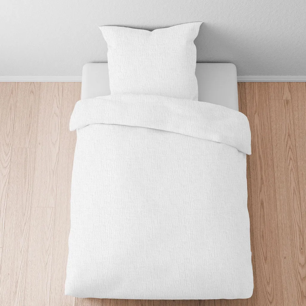 Свойства: 100% хлопок, ок. 130 г/м², мятый вид и структура делают его особенно цепким и мягким, оптимальная циркуляция воздуха, приятный микроклимат для сна, мягкость на ощупь. Уход: обычная стирка 40°C. Разрешено использование кислородного отбеливателя. Разрешено использование обычного моющего средства. Сушка в стиральной машине при низкой температуре (щадящий режим) / 1 точка. Не гладить. Только химчистка. Разрешено использование перхлорэтилена. Размер: 155 x 220 см + наволочка 80 x 80 см. Дизайн/цвет: белый. Узор: однотонный. Этот комплект состоит из одного пододеяльника и одной наволочки. Цвета могут отличаться из-за настроек экрана. Другие предметы, украшения или мебель/кровать, показанные на изображениях, в комплект не входят.