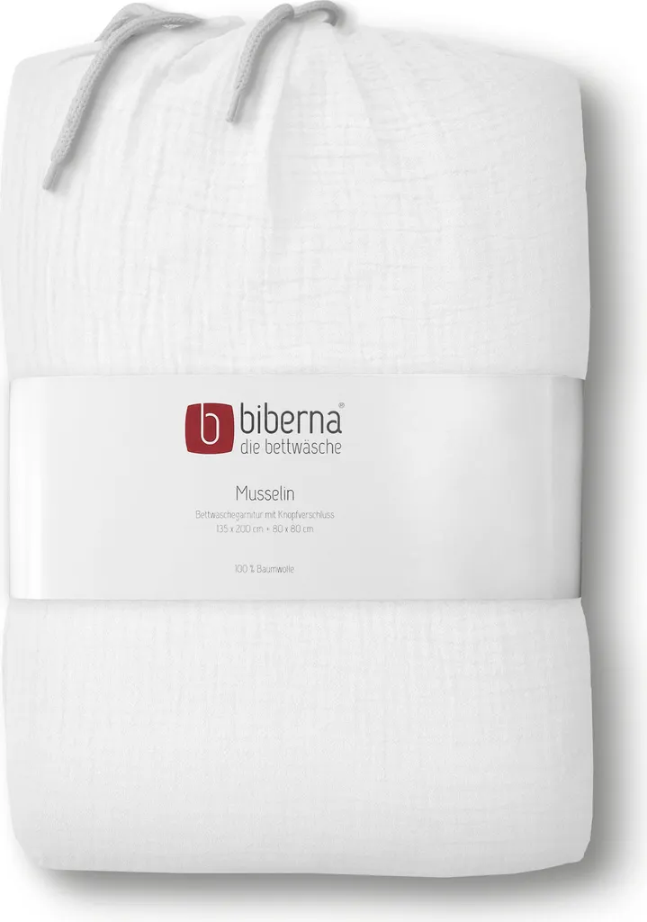 Постельное белье из муслина Biberna изготовлено из 100% хлопка плотностью около 130 г/м². Комплект Biberna можно стирать при температуре 40 градусов в обычном режиме, он застегивается на потайные пуговицы. Разрешено отбеливание кислородом и использование обычного моющего средства. Возможна щадящая сушка в стиральной машине при низкой температуре (1 точка).