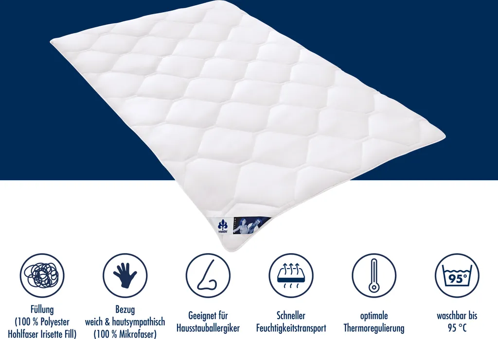 Это одеяло особенно полезно для аллергиков, поскольку его можно стирать при температуре до 95 °C, что гарантирует здоровый и комфортный сон.