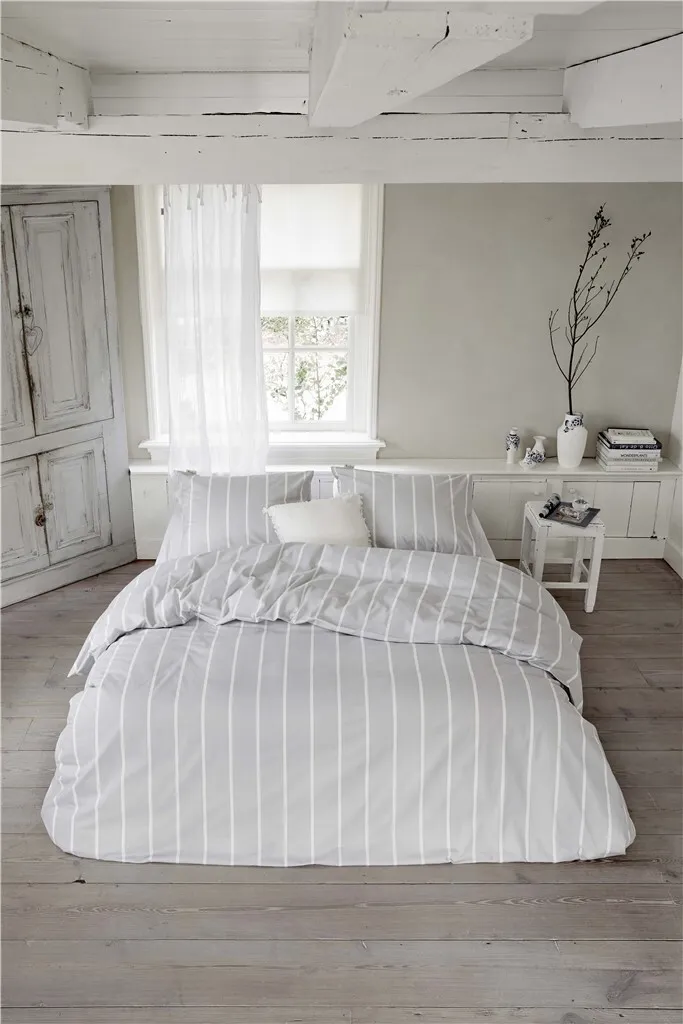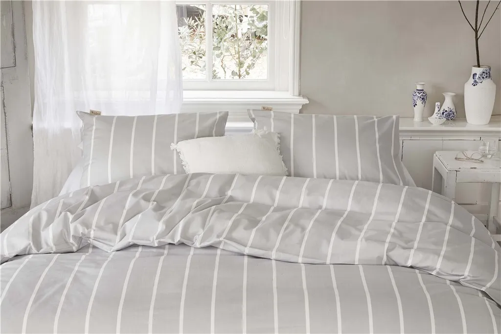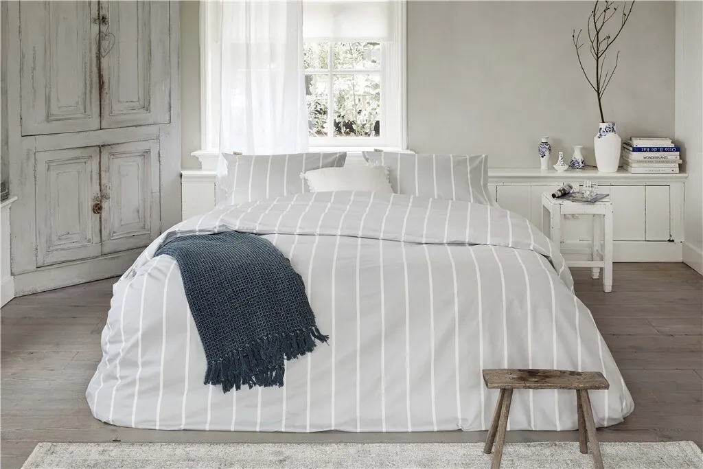 Постельное белье Preppy Pinstripe светло-серого цвета создает нейтральный и элегантный образ. Вертикальные белые полосы по обеим сторонам добавляют особый шарм. Изготовлено из 100% хлопковой фланели, оно особенно уютное и теплое. Идеально подходит для холодных ночей! - Материал: 100% хлопковая фланель - Soft Comfort - NL maten 1-personoons, 2-persons, in lits-jumeaux zijn voorzien eenstopstrook van 20 cm over de ganzele breed. DE Die Einzel- (135 und 155 cm) und doppelsweite Größen haben einen Zipper.