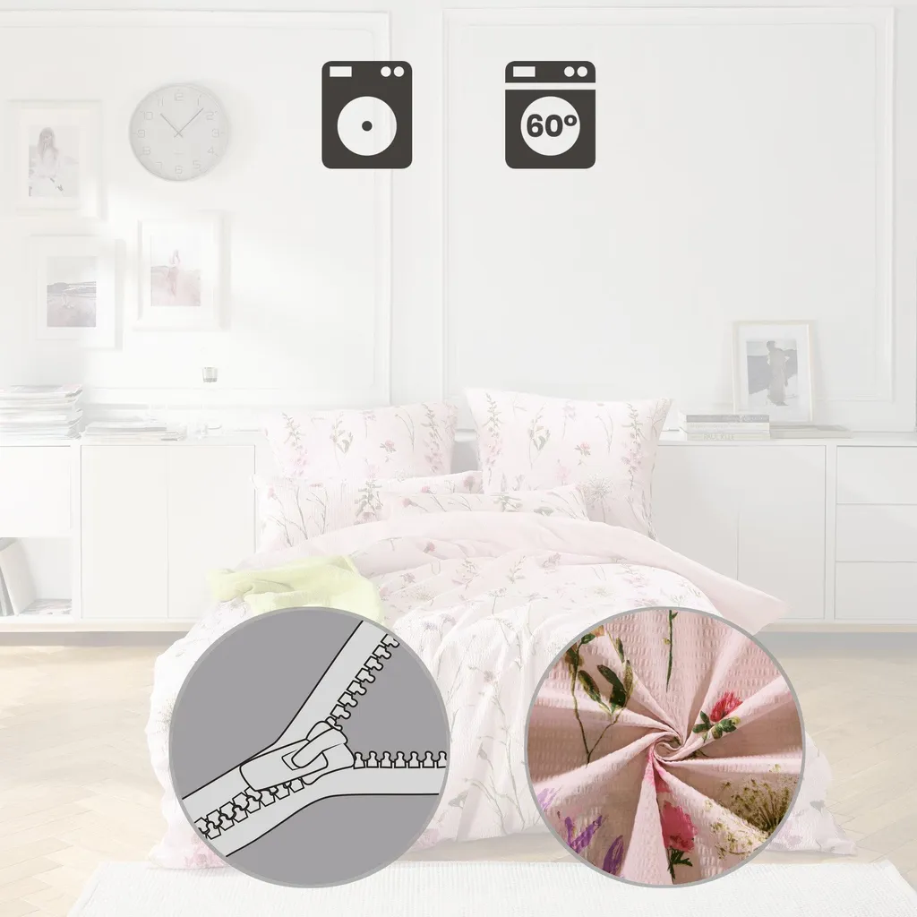 REDBEST Постельное белье из сирсакера. Сказочные полевые цветы создадут очаровательную атмосферу в вашей спальне. Мечты сбываются с этой летней, легкой и воздушной тканью с характерной жатой текстурой. Вы быстро оцените особые качества этого простого в уходе, не требующего глажки постельного белья на молнии: просто постирайте, высушите и положите на кровать.