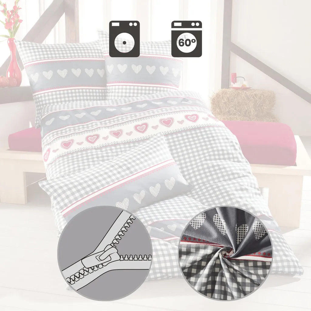 Erwin Müller Тонкая фланелевая наволочка. Сочетание сердечек и мелкого клетчатого узора создает чудесную уютную атмосферу. Она привнесет в ваш дом альпийское очарование и отразит современный дизайн интерьера. Побалуйте себя бархатистой, мягкой тканью с начесом. Мягкое и пушистое белье станет приятным подарком в холодное время года. Мягкая и приятная на ощупь. Удобно надевать и снимать благодаря практичной молнии.