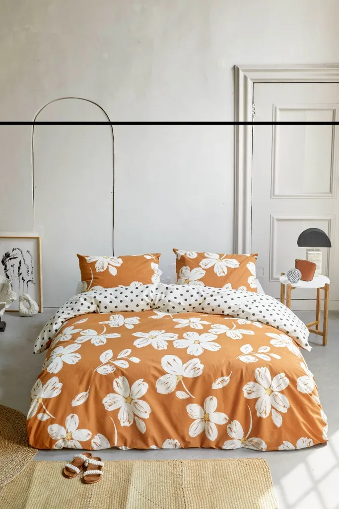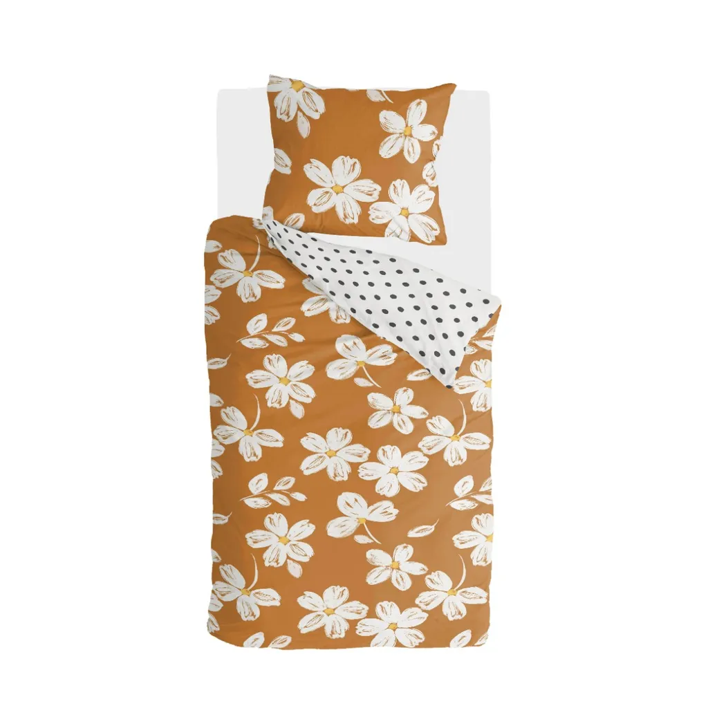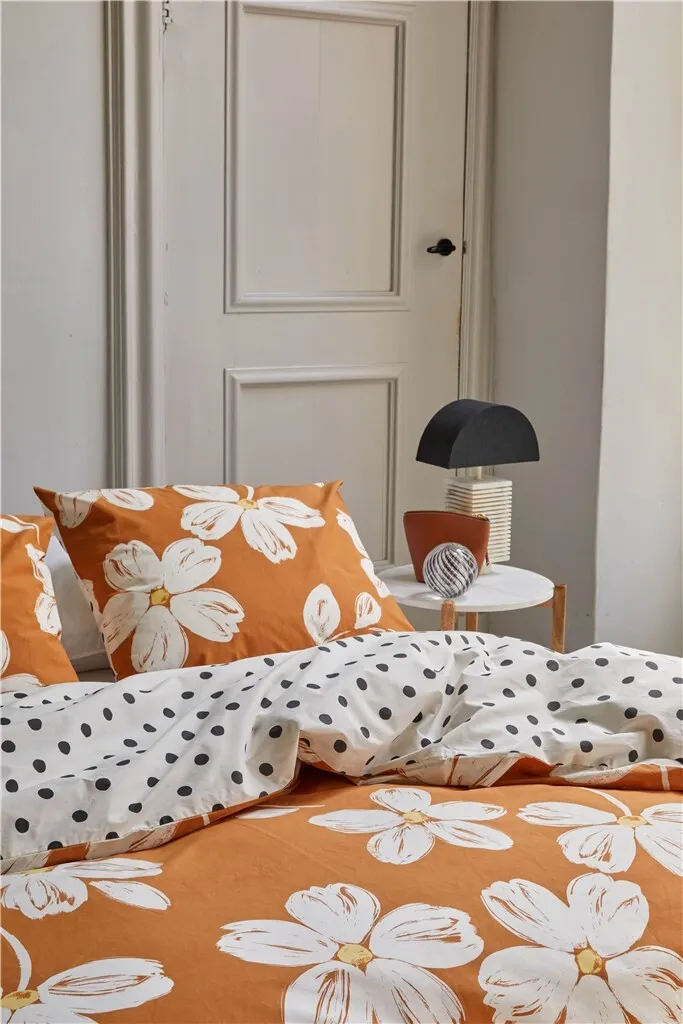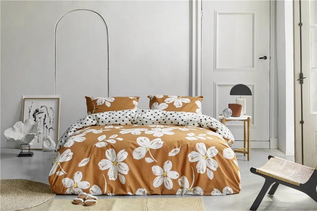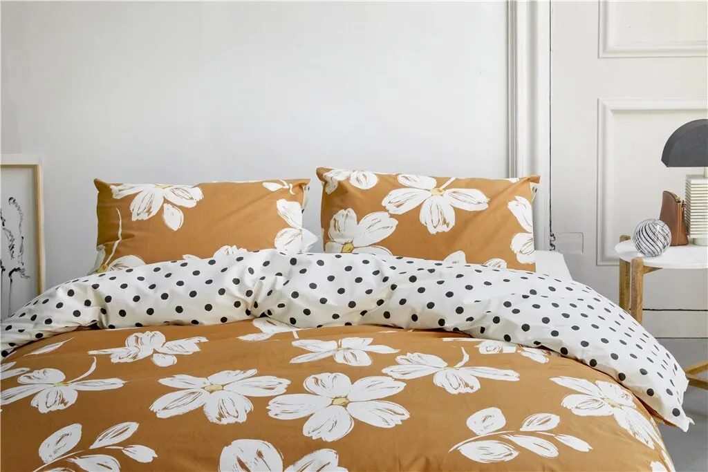 Двустороннее постельное белье Fancy Flowers с одной стороны украшено крупными белыми цветами на коньячном фоне. С другой стороны - черный горошек на белом. Это постельное белье придаст спальне романтический вид. -Материал: 100% хлопок перкаль - Мягкое на ощупь -Размеры single, double и king имеют застежку глубиной 20 см по всей ширине. Размеры single (135 см и 155 см) и double застегиваются на молнию.