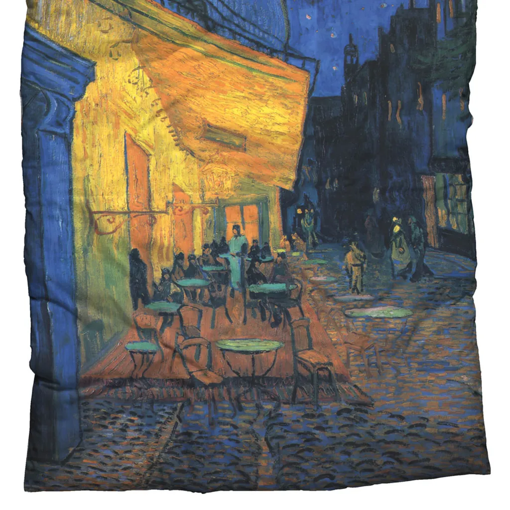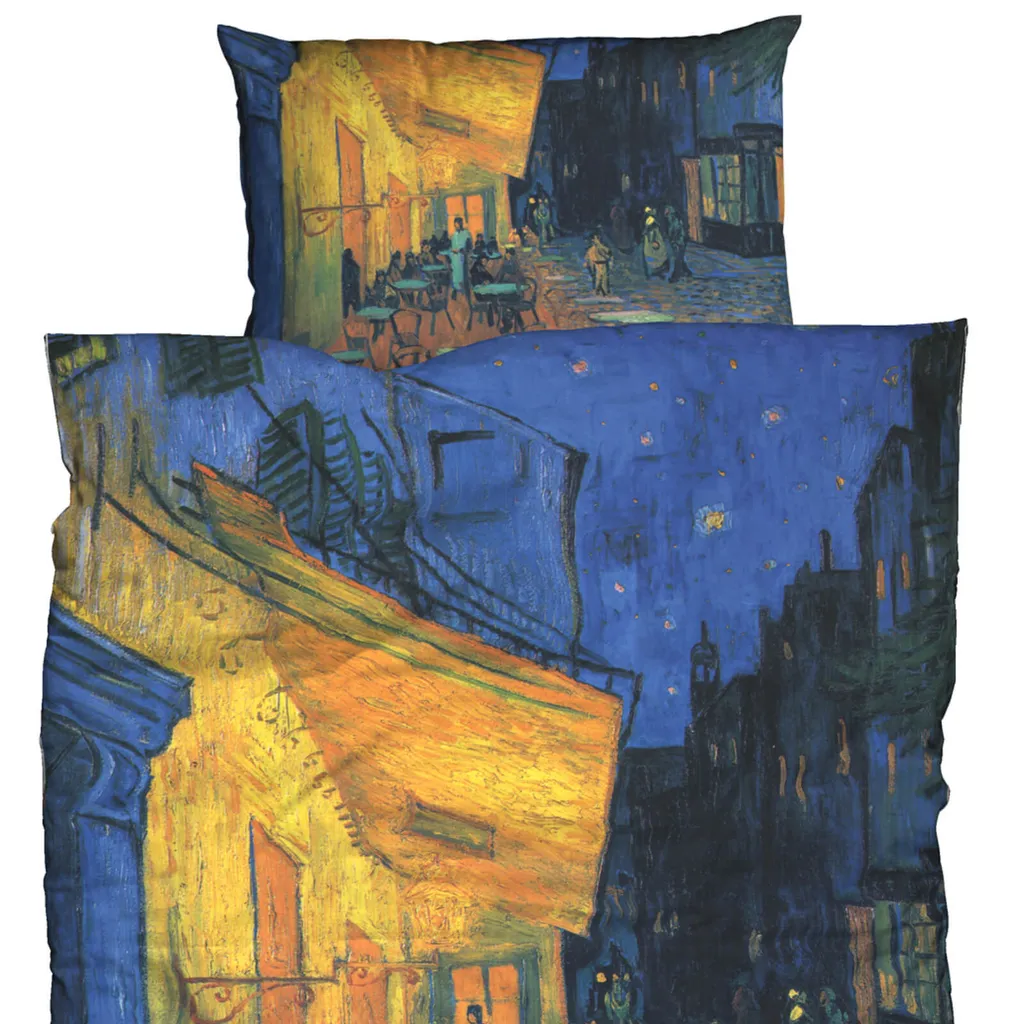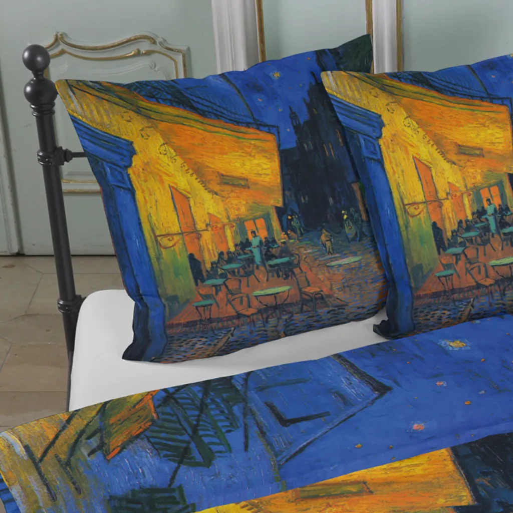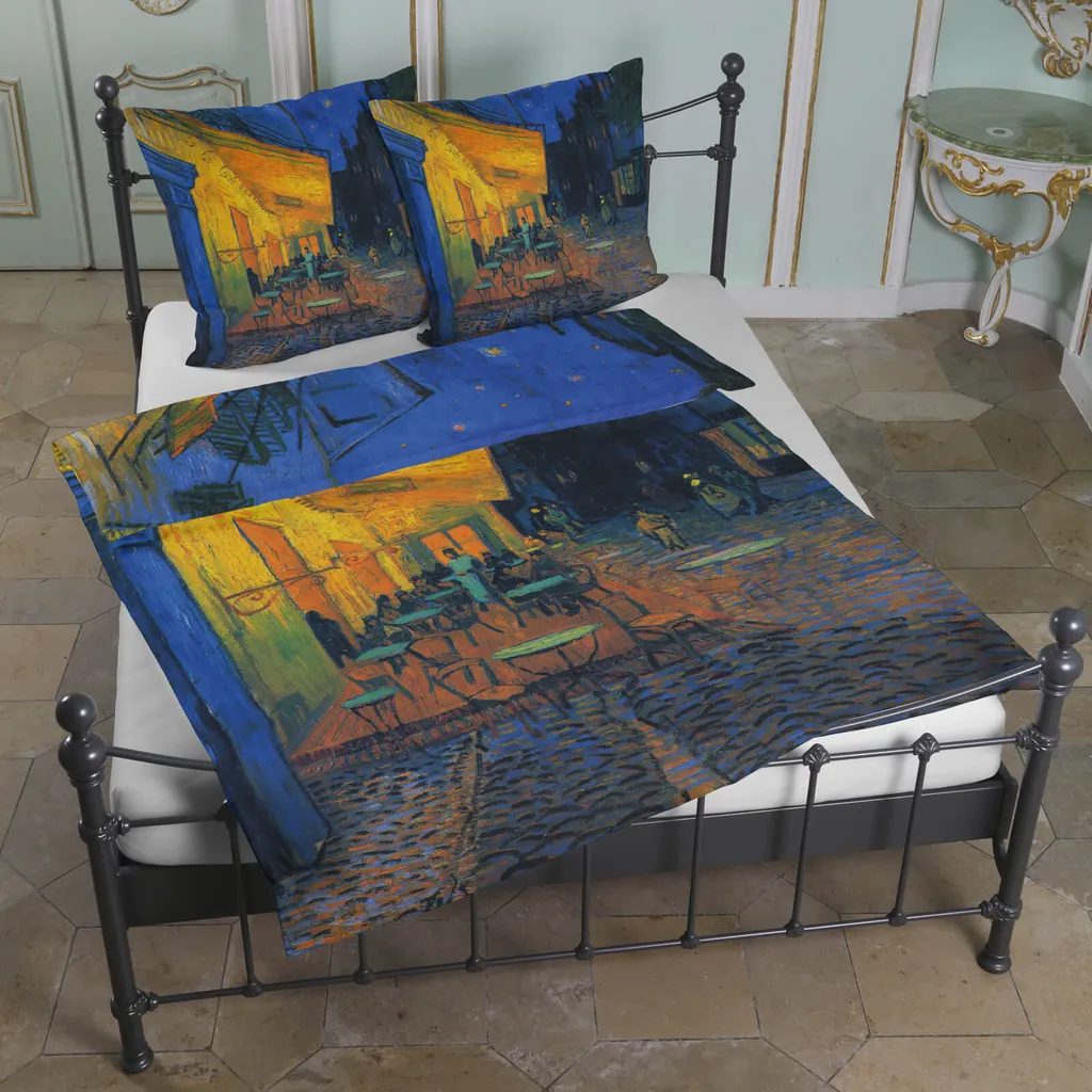 Этот особенный комплект постельного белья изображает ночную сцену с картины голландского художника Винсента Ван Гога (1853-1890). Небо уже стемнело, последние пешеходы идут по мощеной аллее, а в небольшом ресторанчике на углу все еще горит свет. Ночная терраса кафе - действительно очень подходящий мотив для постельного белья, не правда ли? Ван Гог написал это малолюдное уличное кафе в 1888 году во французском городе Арль, и это одна из его самых популярных картин. Особенность картины заключается, во-первых, в перспективе, а во-вторых, в том, что это первая картина, на которой он изобразил сверкающее звездное небо на горизонте. Ночное небо позже появится и на других его картинах, например, на картине Звездная ночь над Роной, также написанной в сентябре 1888 года, или годом позже под названием Звездная ночь. Картина, послужившая основой для этого двухкомпонентного комплекта постельного белья, была написана Винсентом Ван Гогом маслом на холсте (81 x 65,5 см). Ее можно увидеть в музее Креллер-Мюллер в Оттерло, Нидерланды.