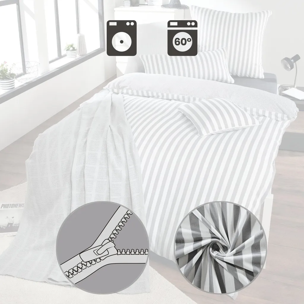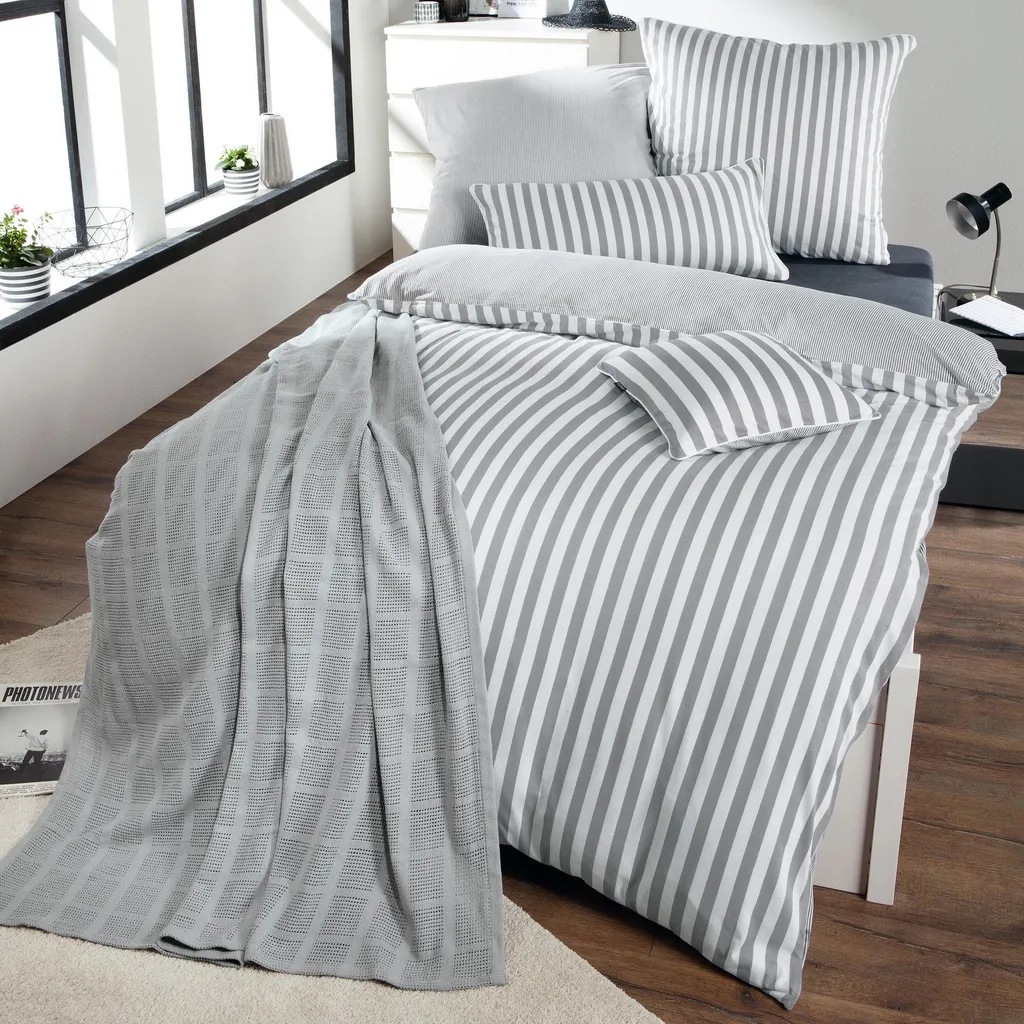 Erwin Müller Двусторонняя наволочка из одинарного джерси. Сочетание двух полосатых узоров создает разнообразие и яркие контрасты. Трехсторонняя окантовка наволочки добавляет элегантности. Вас покорит изысканное, нежное, универсальное качество. Она исключительно мягкая на ощупь, красиво драпируется и дарит приятные ощущения коже. Эта мягкая, слегка эластичная трикотажная ткань не только дышит и регулирует температуру, но и не мнется и проста в уходе. С застежкой-молнией для легкой замены чехла.